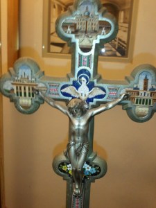 Jesus is hanging on a metal cross. This cross is part of a stand so it is freestanding rather than designed to hang on the wall. The metal is silver and Jesus is silver and the nails that are attaching him to the cross are silver. The cross and stand are about a foot and a half tall and the base is round. The cross is not just two straight pieces of metal in the shape of a T, but rather the T has scalloped edges on both sides and on top. The element that makes this crucifix different from others that I’ve seen is that around the base and up through the T of the cross, there are intricate mosaic pictures. For example, right behind Jesus’s head is a white dove with its wings spread on a blue background. The dove has a halo around its head and the mosaic work is so fine that you can see individual pieces that have been placed to show the feathers on the dove’s body and on its wings. The dove’s beak is yellow and its one eye is black, but you can also see the white of its eye next to the black pupil. On each of the three points of the T there are buildings created in tiny pieces of mosaic tiles. The top one has three domes and suggests it might be St. Petersburg, where the Russian Orthodox church resides. All the buildings are public buildings, not churches, and they all have columns out front and many steps leading up to their wide porches and each has a tower on top. This is quite an accomplishment in tiny pieces of mosaic, and the time it must have taken to construct these scenes, which surely were hand done, must have been considerable. I can imagine a dark headed man leaned over a work table, carefully selecting each tiny piece of tile to form the varying shades of blue sky that serve as the backdrop to these buildings. That man would have to possess such patience to undertake this sort of art work, creating pictures one tiny piece at a time.