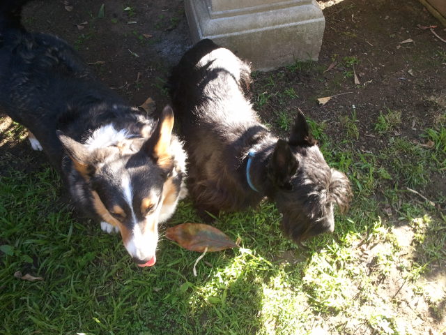 Cordelia and Sammie are my only companions this afternoon. They are in the backyard, too, barking occasionally at a squirrel that taunts them from the limbs of the avocado tree. The rest of their time they are either dashing from one end of the yard to the other in pursuit is some insect or mysterious sound, or else lying in the grass, resting. Oh, the joy of being a dog.