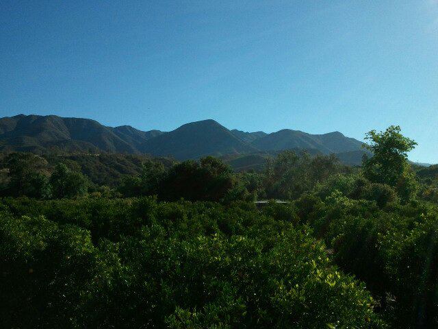 Ray and I arrived just at sunrise in Ojai at around 6 am. I have included pictures of what you can see from the different directions around our orange grove. We climbed up on the roof of our trusty old Spartan trailer for many of these. Here they are: