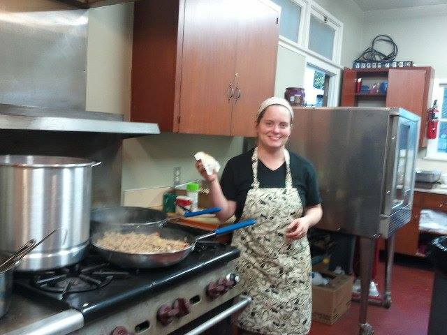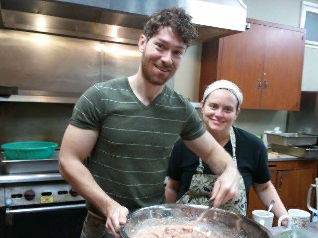 Here is our bride, Sarah, making a giant pot of tomato sauce and ground turkey for the filling: