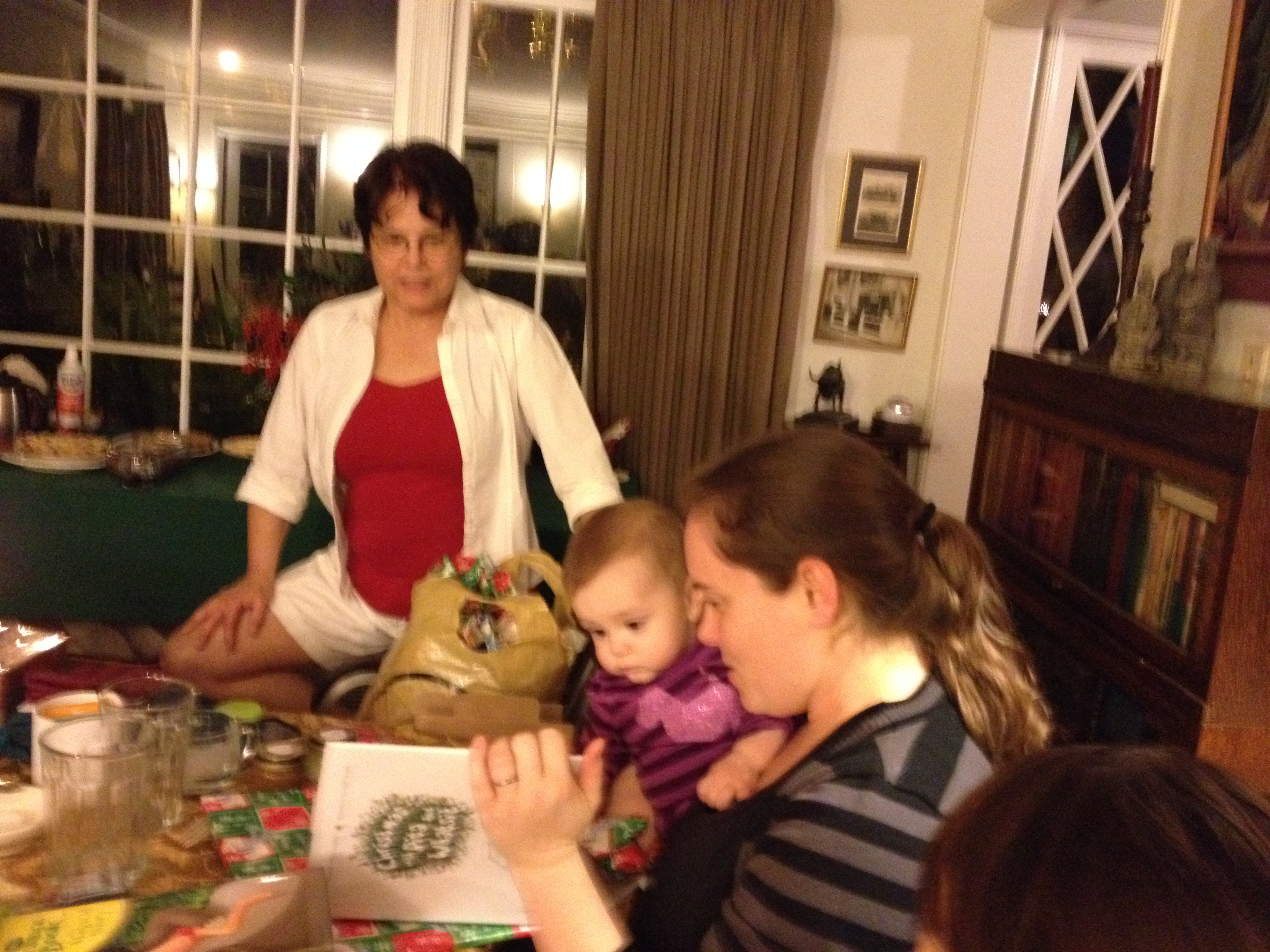 Here I am in a rather indelicate pose – I think I was kneeling on a chair while watching gifts being examined by Sarah and Luna.