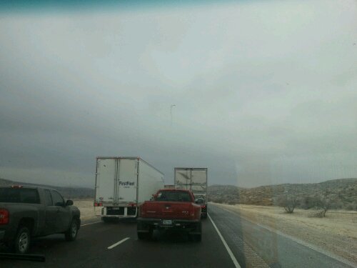 There is light snow falling and it is cold.  It was 27 degrees when we went through Midland and it feels colder now though I can’t get enough bars on my phone to check the temperature in Van Horn, Texas, the nearest town.