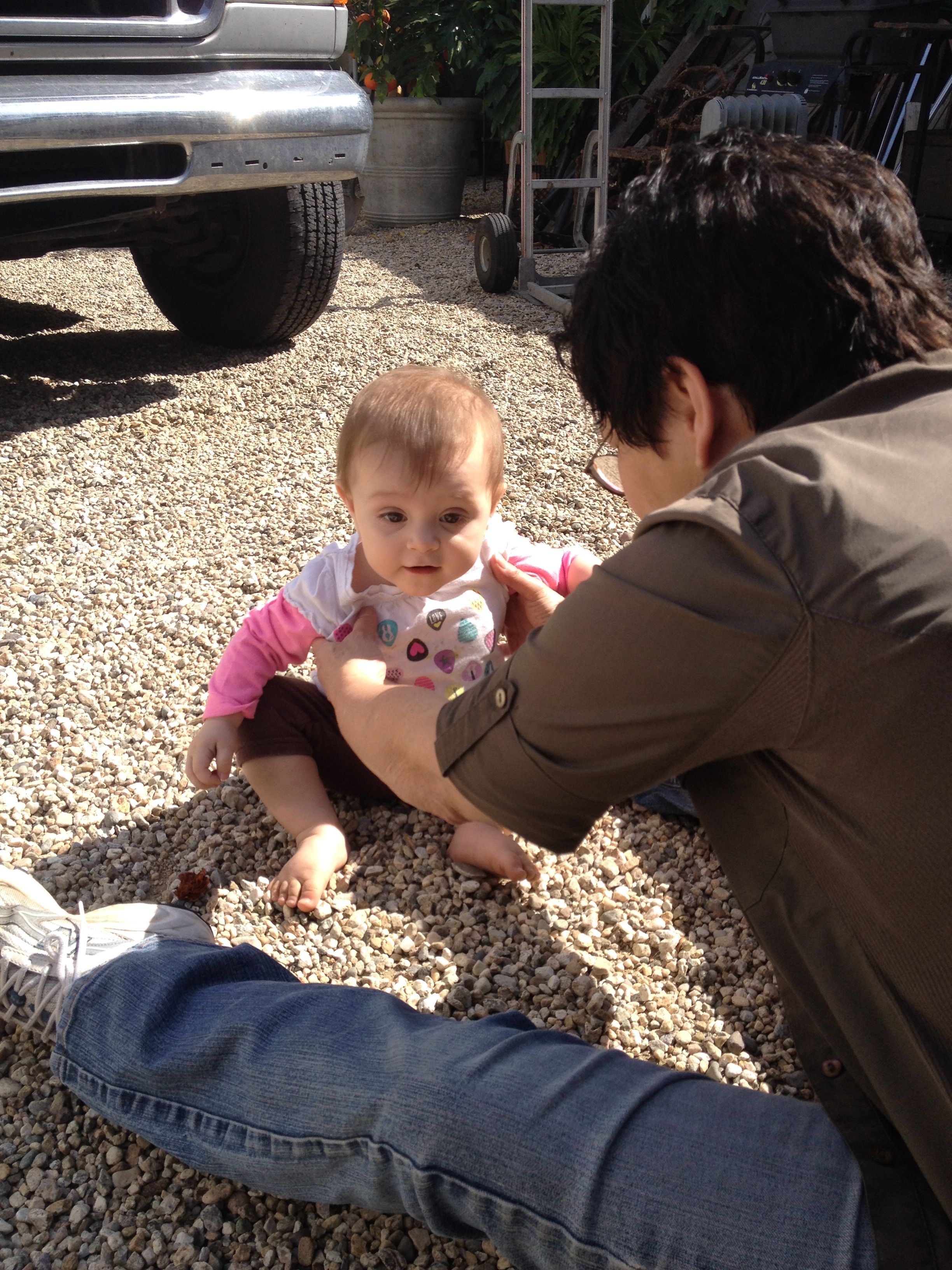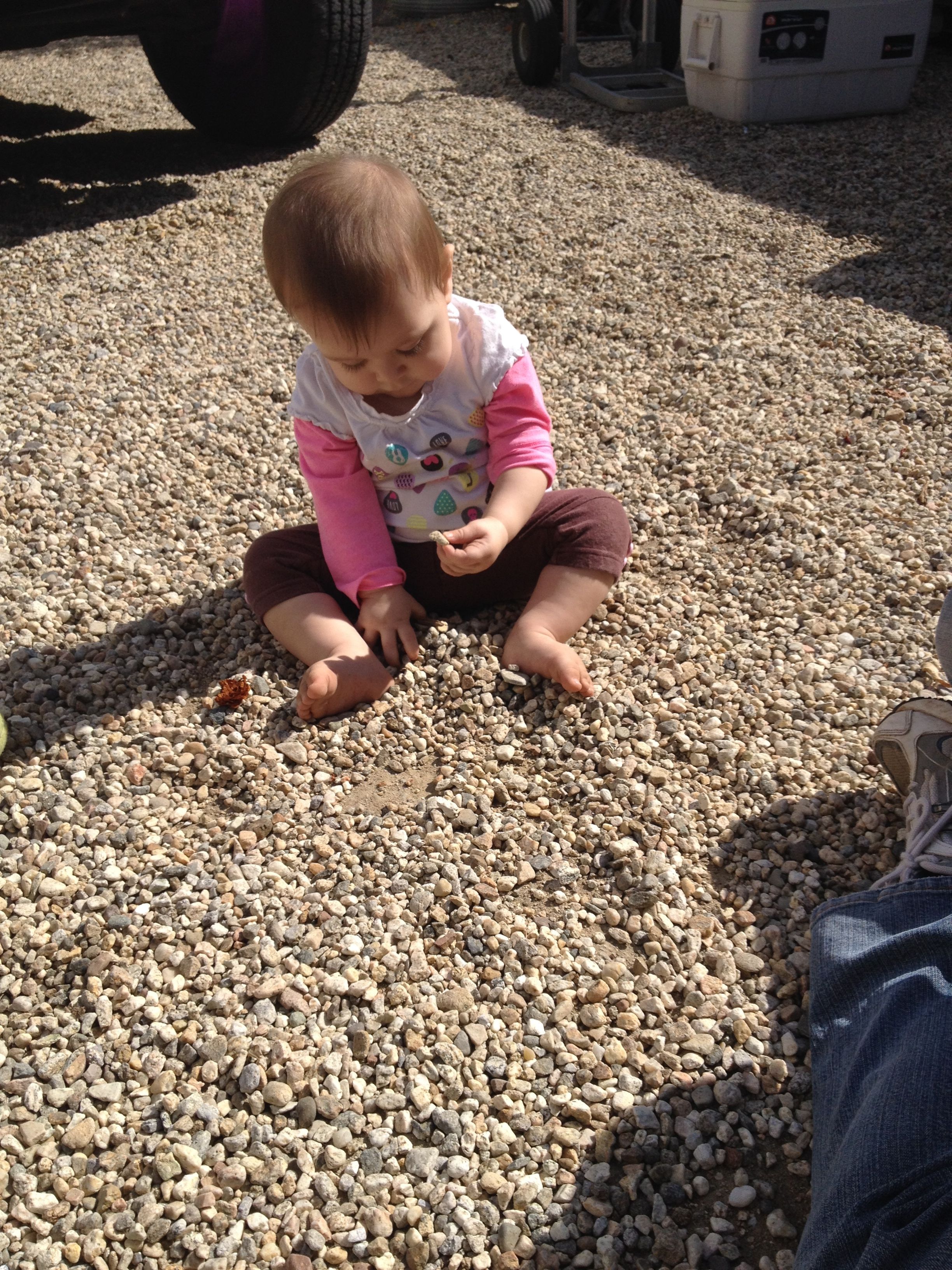 Little Luna (10.5 months) came to visit today and she had a whale of a time discovering the joys of all the gravel that covers our back driveway. She and I sat down in the sun (it was 73 degrees today – sorry you folks in the snow) on the warm rocks. She scooped up handful after handful of the tiny stones and let them fall slowly back down. Occasionally, she tried to slip two or three in her mouth, but I was there to divert her hand. Our dogs, Cordelia and Sammie, were nearby sunning, too, and keeping watch. Luna has taken to calling them “Bah,” which we all presume to mean doggies. “Bah, bah, bah,” she kept repeating all day, particularly when she was crawling from one spot to the next on the driveway as she followed the dogs, ready to settle near them and reach for the next handful of stones. She was also barefooted, so she would dig her feet in the gravel as well, clearly enjoying the warm rocks and the tickle on her tootsies.