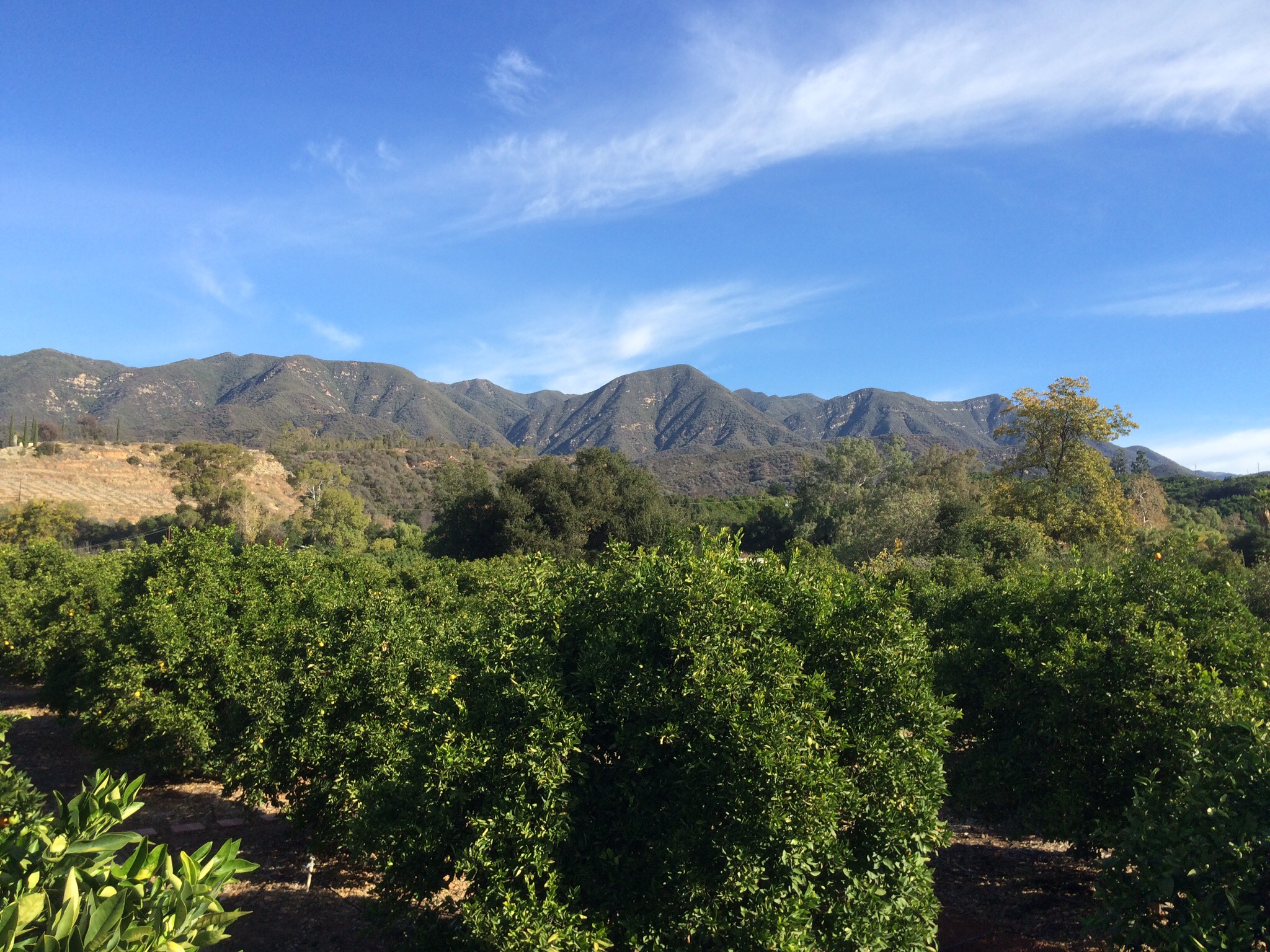 Ray and I are at the orange grove in Ojai. The kids are all coming tomorrow for our birthday celebrations, but since we were already in Santa Barbara for business, it made since to come on over here and get settled. (Santa Barbara is 25 miles north of Ojai.). It is currently 6:54 pm, and it is already dark and quiet. Except for the occasional sound of a car off in the distance or the periodic scratch of a tree limb on our Spartan Manor, there are no other sounds.
