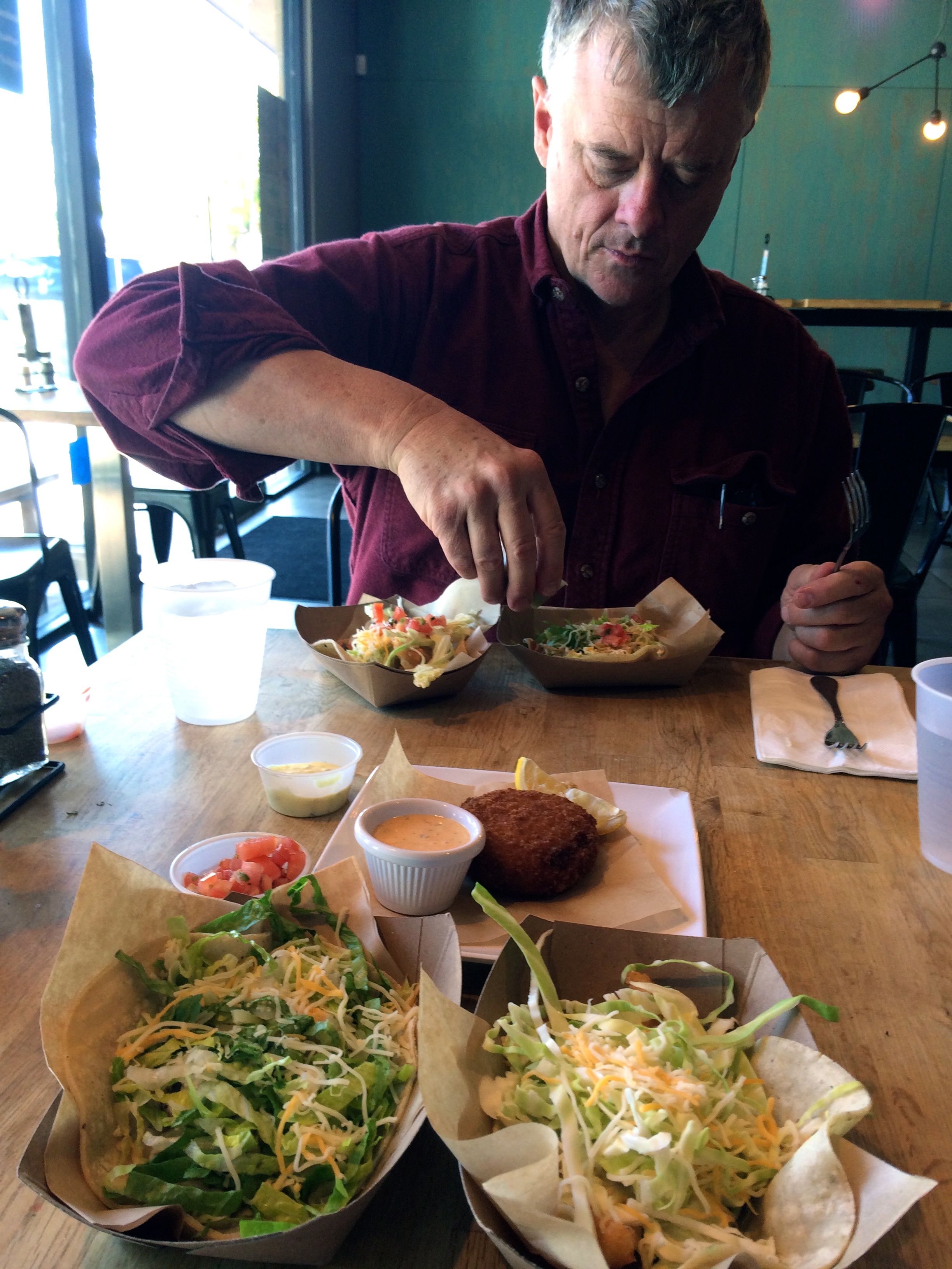 Krab cake, fish and chicken tacos and condiments