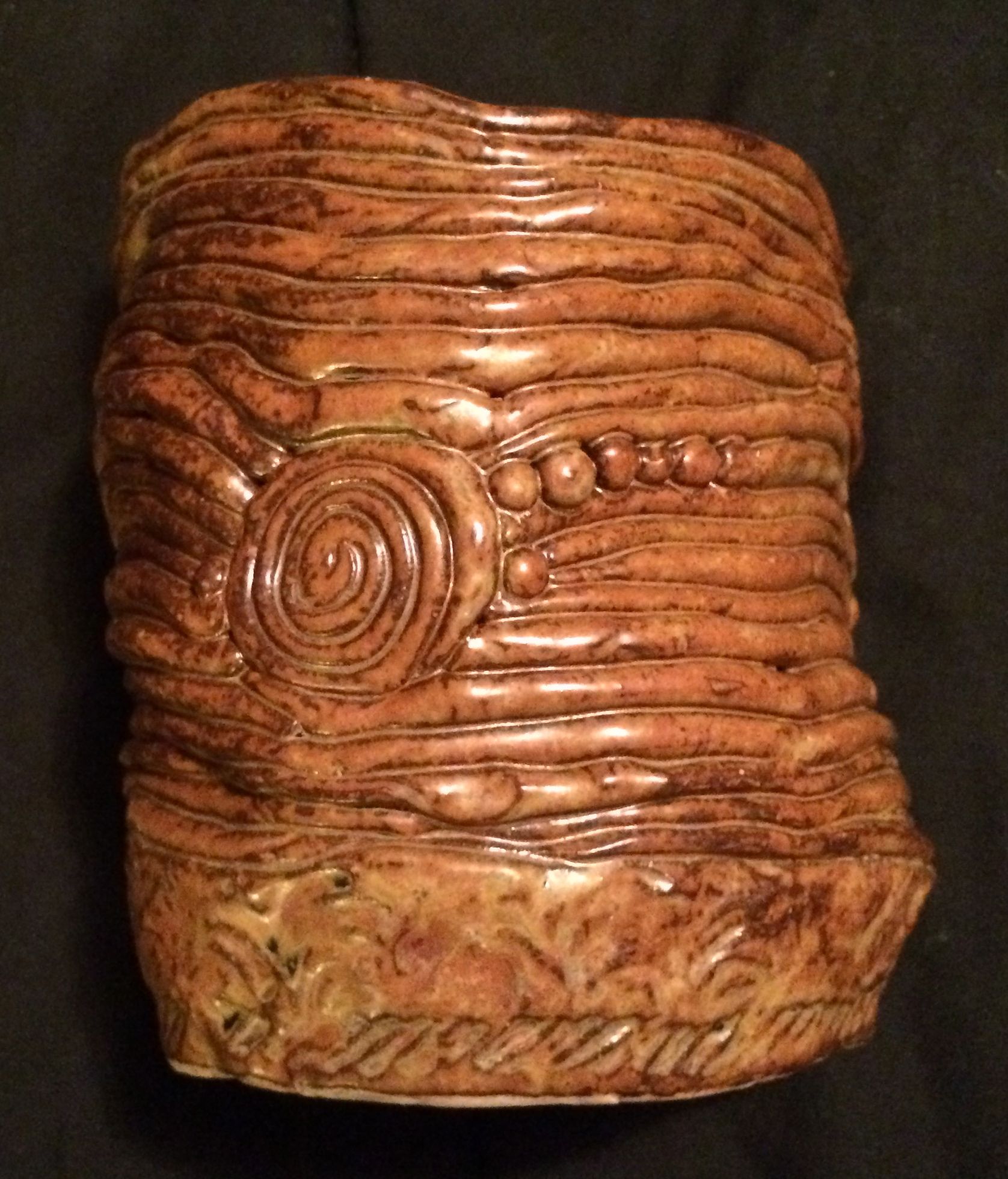 Here are two of the products of my ceramics class. On is a coil pot and the other is from a slab of clay that I decorated before it was glazed.