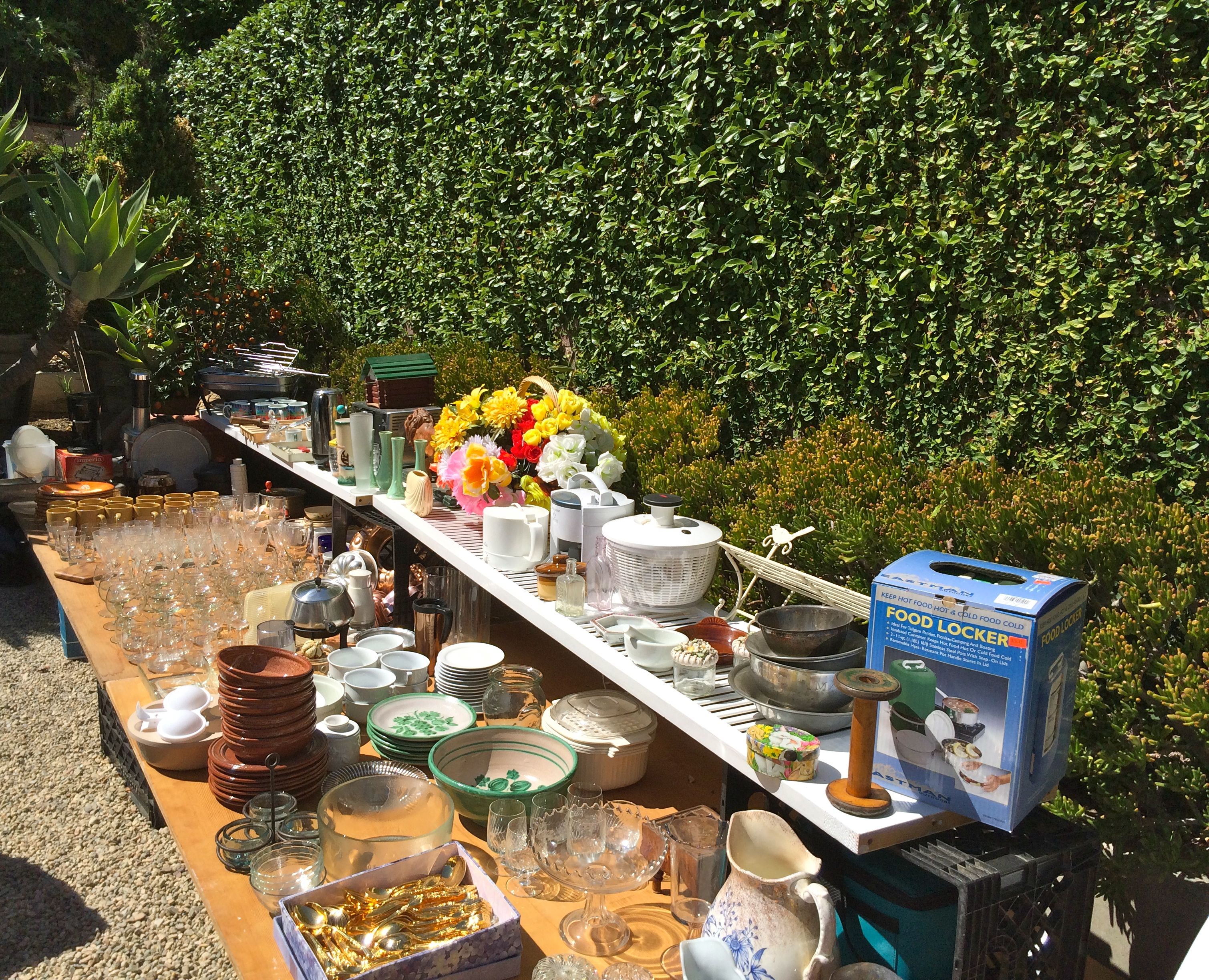 Well, tomorrow’s the day and the time is 9 am. The location is 713 North Doheny Drive, Beverly Hills, which is halfway down the hill between Sunset and Santa Monica Boulevards. We are having our big garage sale with tons of goodies. These include lots of kitchen ware, nice side tables, a big dining room table, chairs, an almost new gas stove, lots of crystal stemware, religious icons both Christian and Jewish, lots of crystal vases and bowls, some big Asian vases and bowls, knickknacks, picture frames, framed pictures, several funny decorative figures, art supplies, a big wonderful easel, rugs, light fixtures and lamps, computer and camera equipment, jewelry, gift items, loads of books, loads of nice stuffed animals, a 1991 Jaguar, and much more.