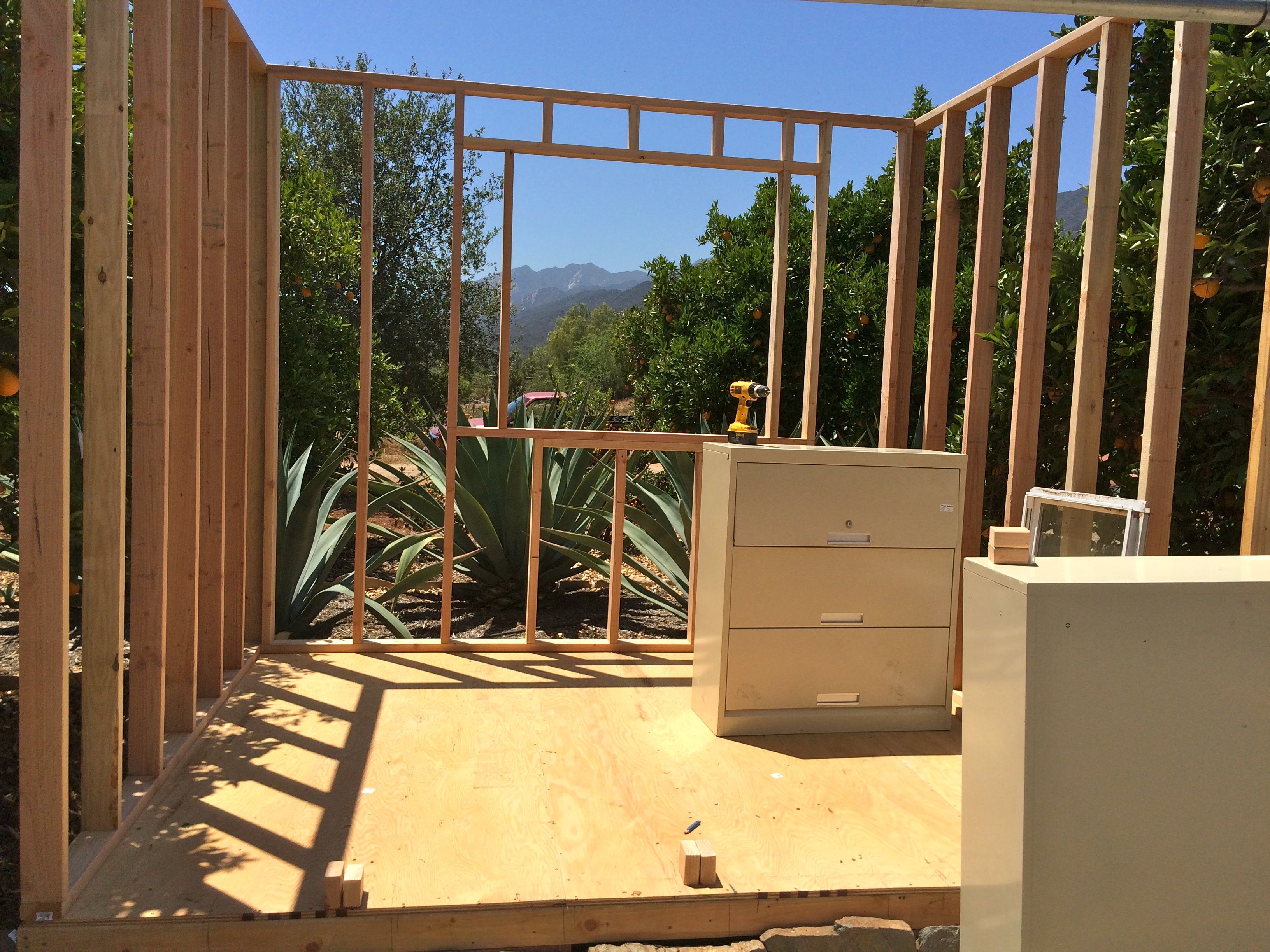 The east wall (the one that is not up) will be primarily the glass front door and the smaller window. It’s not showing in this picture because I had to leave before the fourth wall went up.
