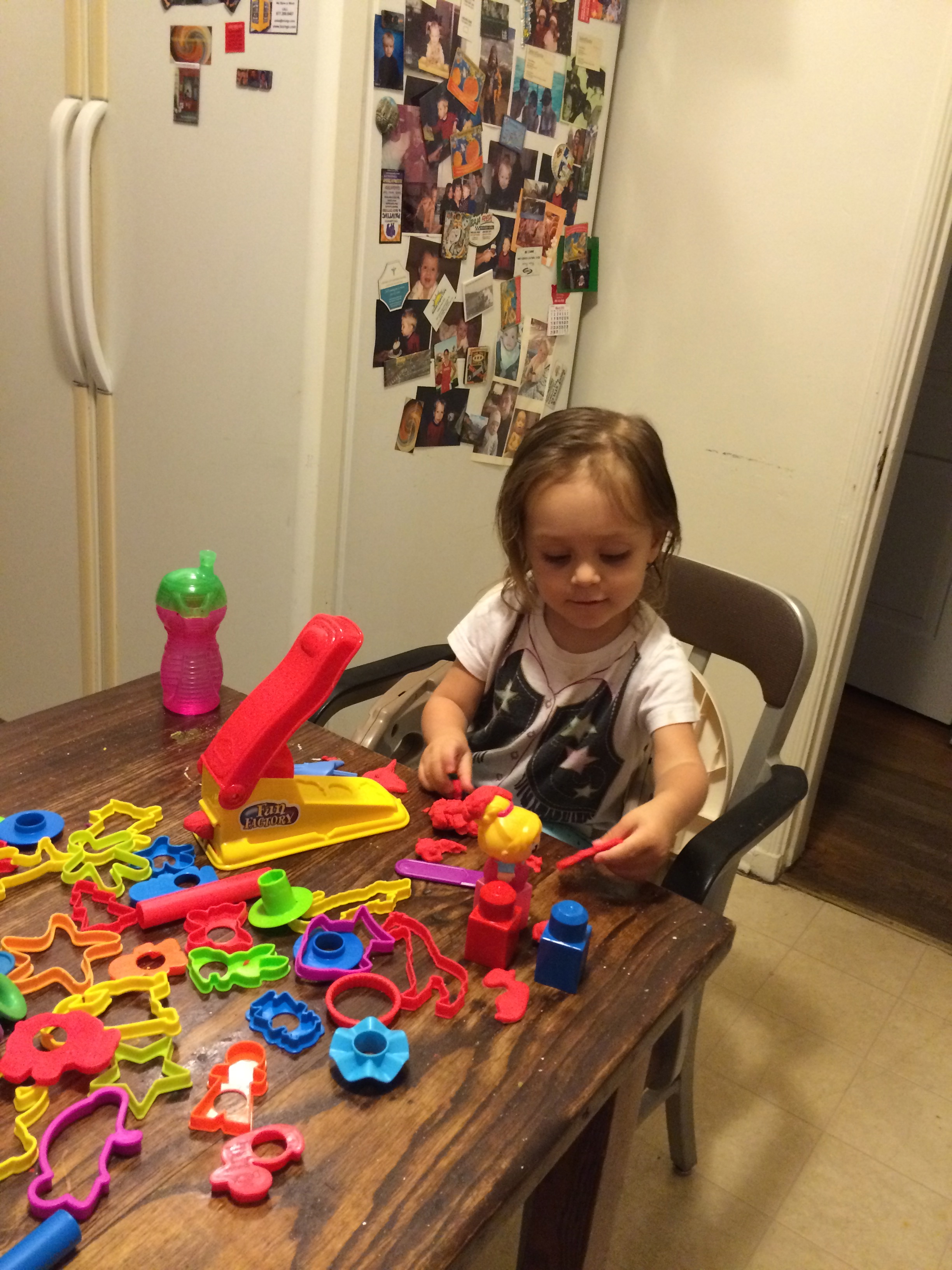 We hosted our little granddaughter, Luna, last night for a sleepover. This, of course, was a treat. She brought her new play-doh set with her and spent at least 2 hours working at the kitchen table. She and I made different shapes from the various cut-outs that came with the set. A mama, daddy, little girl and baby was one grouping she particularly liked. She pointed to the baby and said, “Peanut.” This is the name her little brother has been assigned in utero. She also was very excited about the extruder, which she used over and over. I was impressed with her level of concentration. She was adding eyes and mouths to the animals she made with the cut-outs. I hadn’t even considered going into that level of detail.
