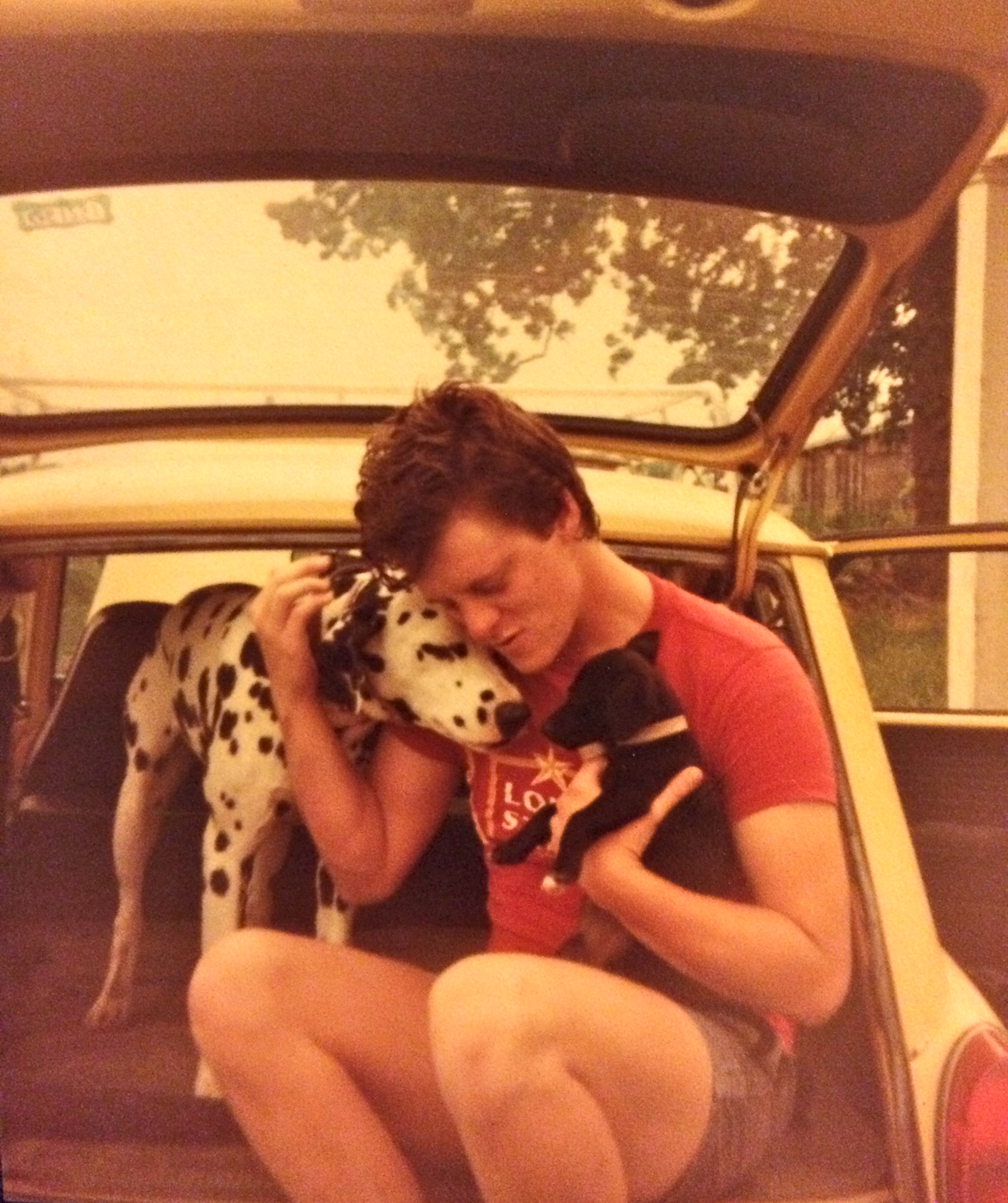 Ray is demonstrating his love for dogs. He still has that quality. Very endearing. Probably 1982.