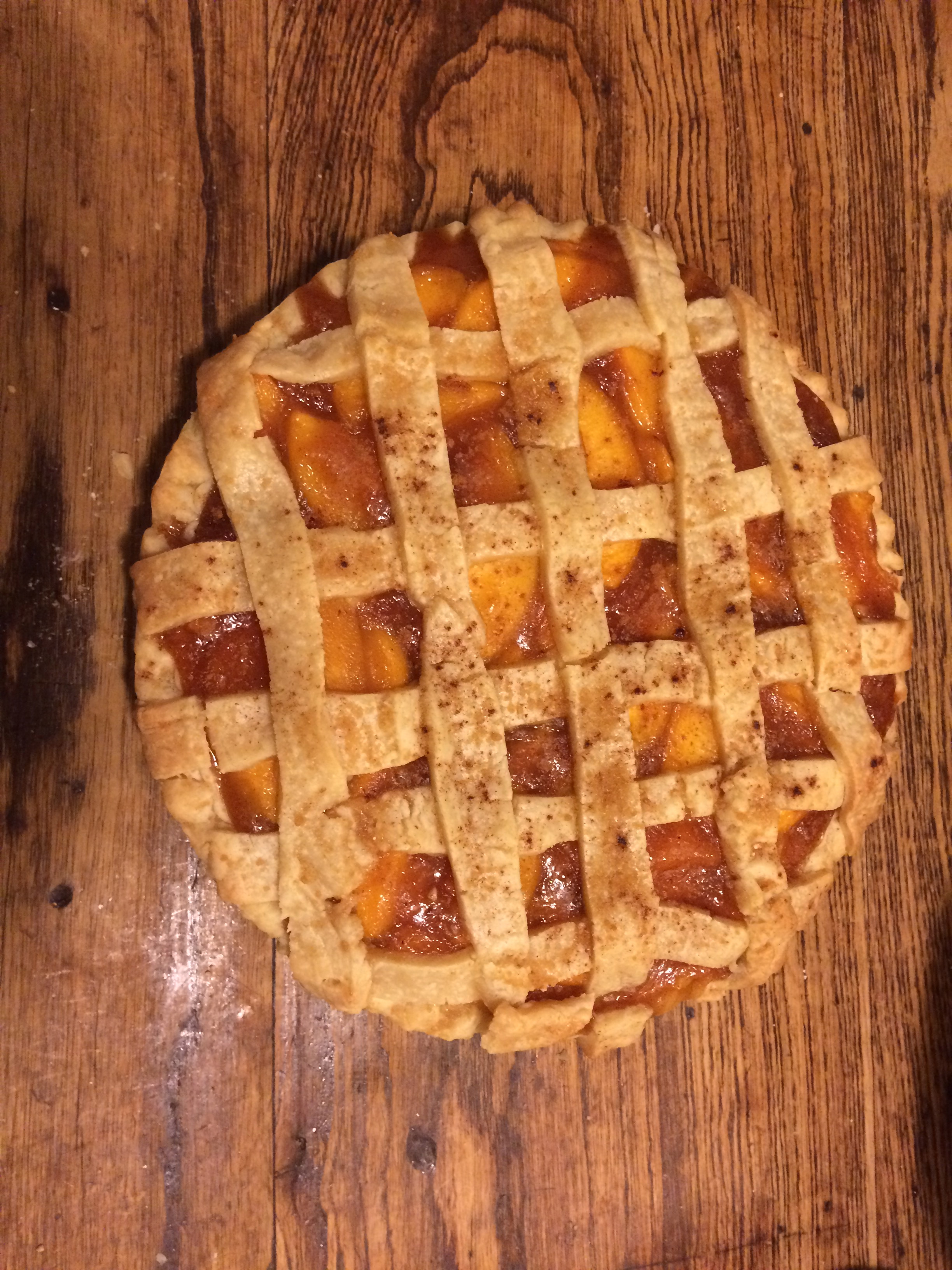 I made a spicy peach pie this evening. I had hoped to make this while my cousin and his wife were visiting (they left today), but I just didn’t have time since we were so busy. (Sorry, cuz). Anyway,