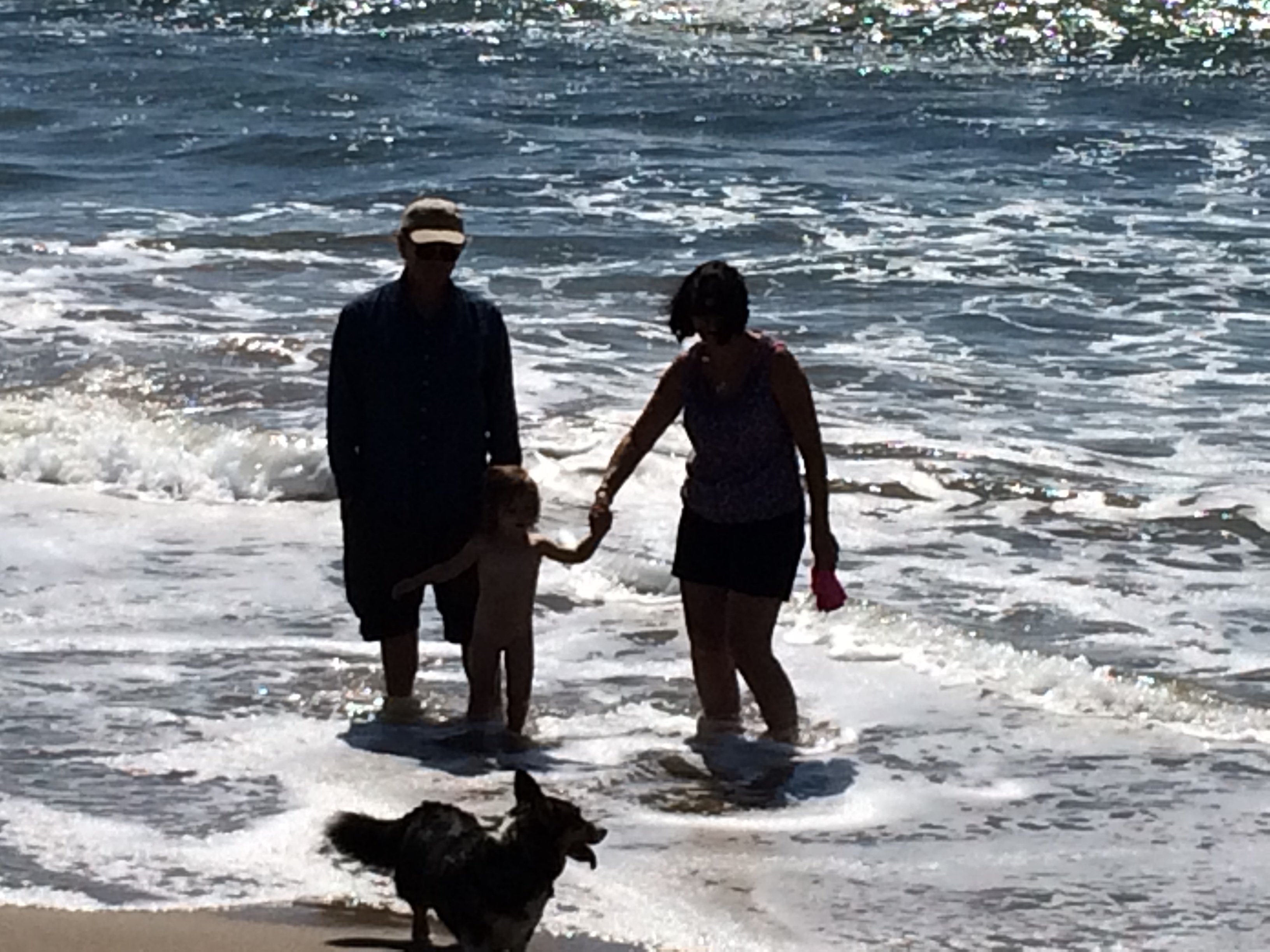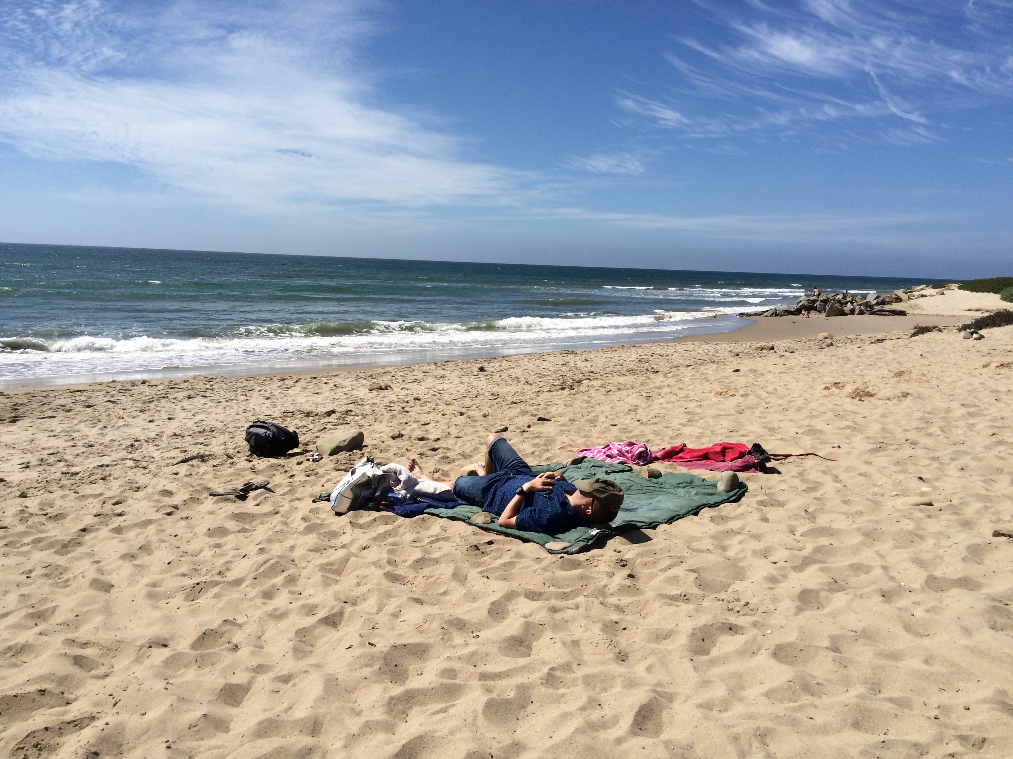Near noon, we headed down to Ventura beach and discovered that we had come on a day when almost no one else was there. Luna, Jan and I played in the surf while Sammie and Cordie ran along the water chasing seagulls and Rich and Ray rested on blankets in the sand. The sun glinting on the water, the rhythmic sound of the surf, and the perfect 77 degree weather created a picture-perfect afternoon at the beach. Luna would have stayed until dark if we hadn’t had to get back; Cordie and Sammie were just as reluctant to leave.