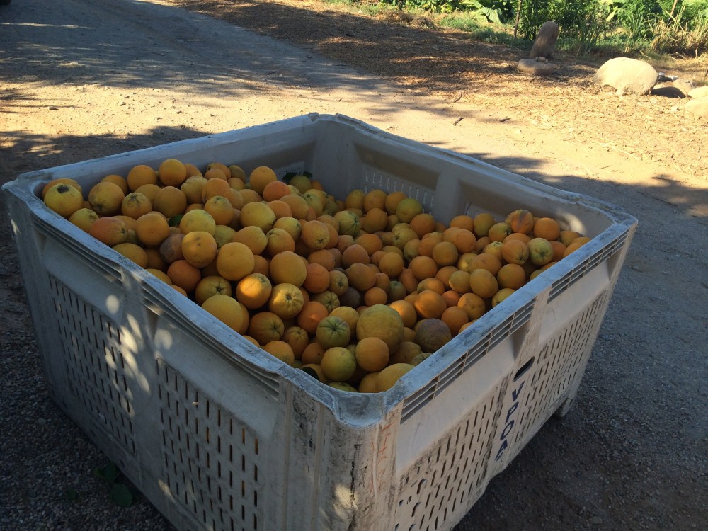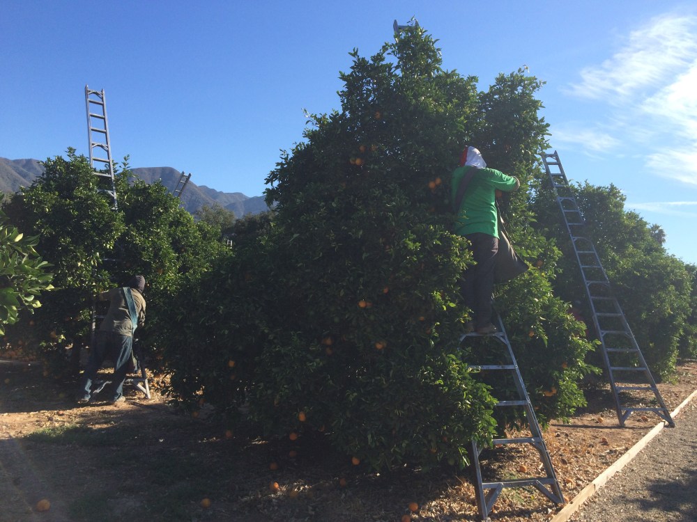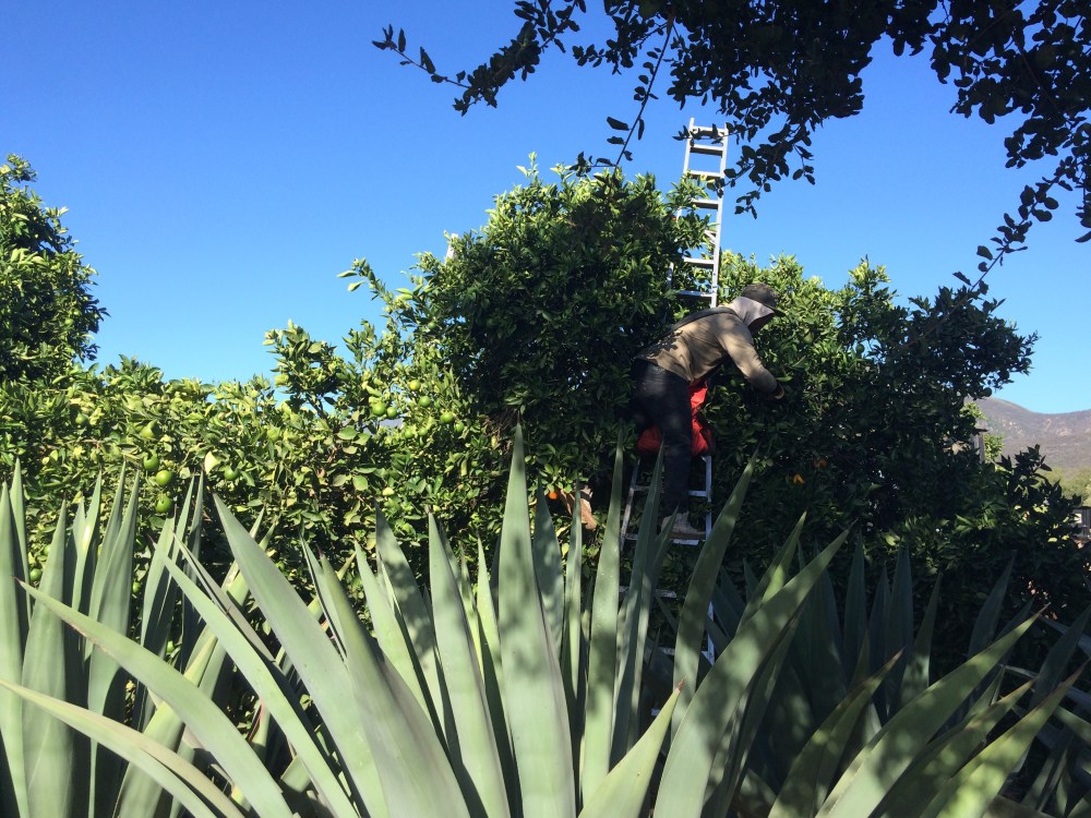 The pickers were a lively group, chatting from one tree to the other as they worked. One sang as he picked. Another brought a boom box and had happy Latin music playing. They smiled as I snapped their pictures. A big truck came and gathered up the large white boxes full of oranges headed to Sunkist.  A neighbor visited and remarked, “Your trees are beautiful.”  Overall, a positive event.