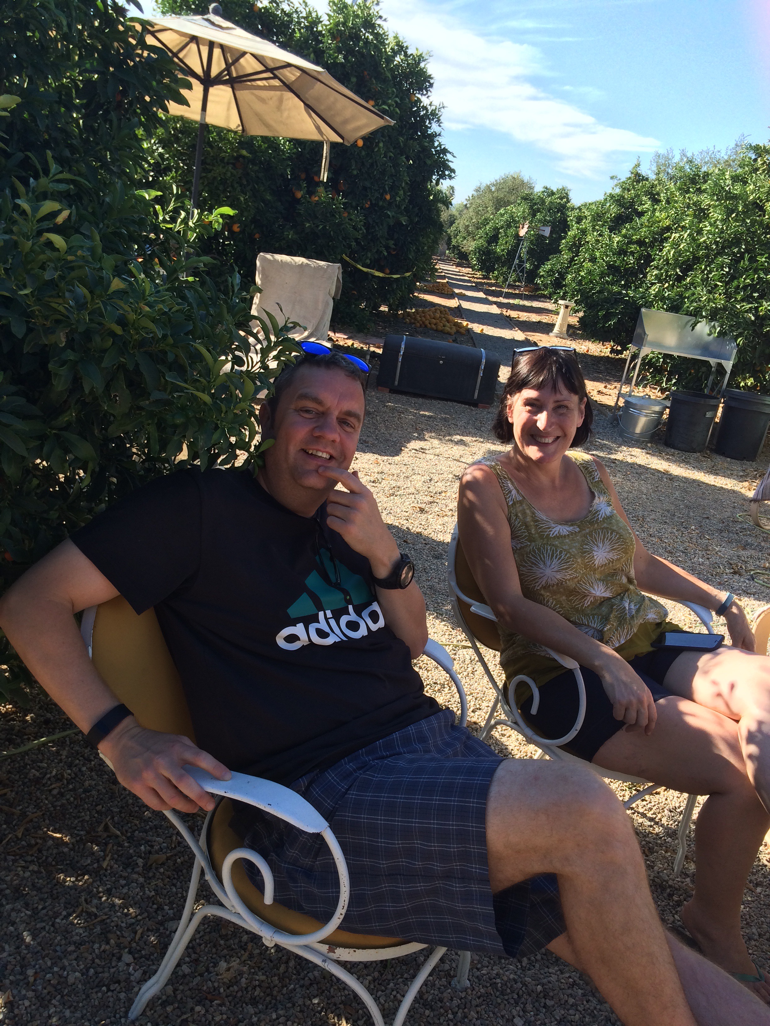 We are up at the orange grove with  two sets of out of town friends: Jan and Richard Davies from Wales and Jared Tredway from Texas. This is a treat in itself since these are folks who appreciate the rustic charm of the grove. It also gave us the chance to be here when the pickers arrived to strip our trees of all the ripe oranges (the green ones are in mid growth).  Here are photos of Rich and Jan plus the pickers, who arrived promptly at 6:30 am.