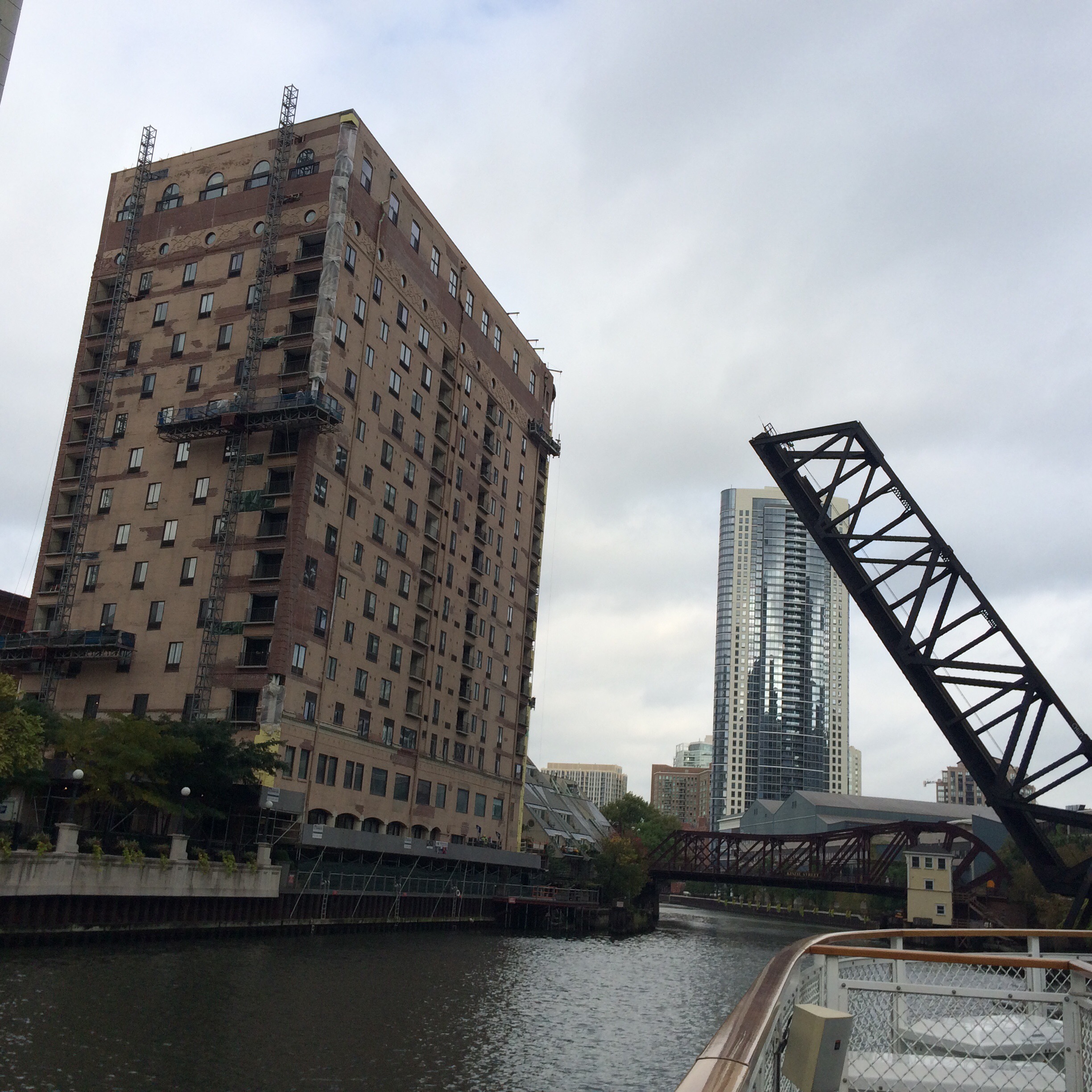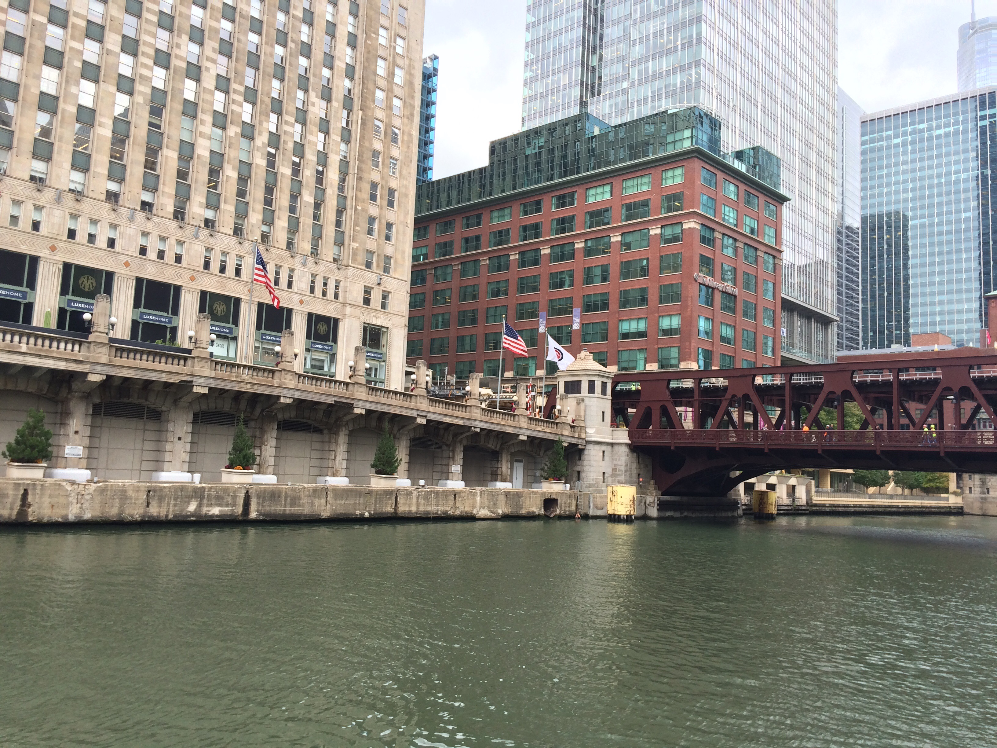 We spent an hour and a half this morning on the Chicago Architecture Foundation’s river cruise, and I must say that our docent was amazing and the view from the river of all the buildings was well worth the money spent. (Ray determined before we arrived in Chicago that joining the CAF would be very helpful since it allowed for priority “line-jumping” for every site on the architectural tour over the weekend – which proved to be a godsend since some of the lines were half a block long – plus it included a ticket for the river tour.). Alas, the river tour was fabulous.