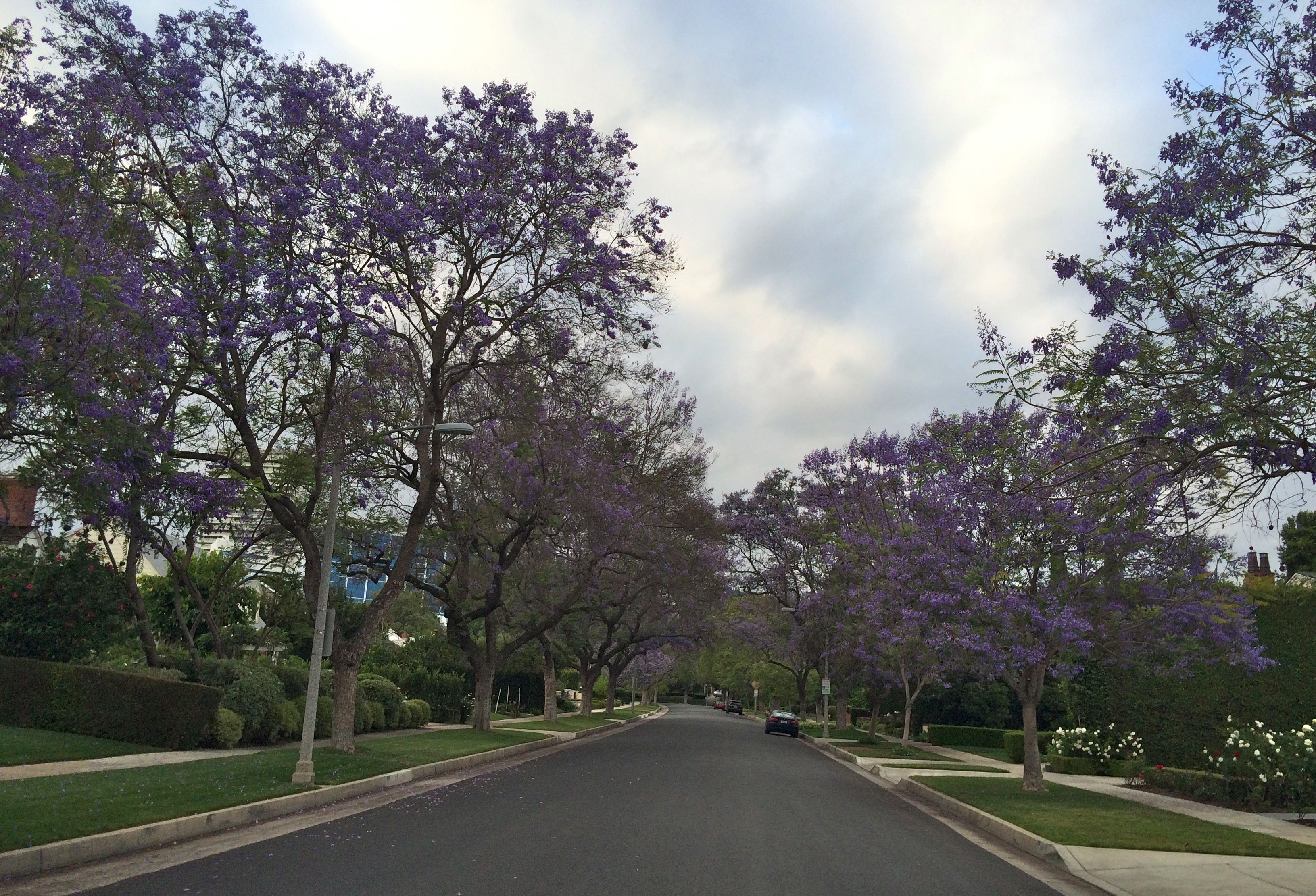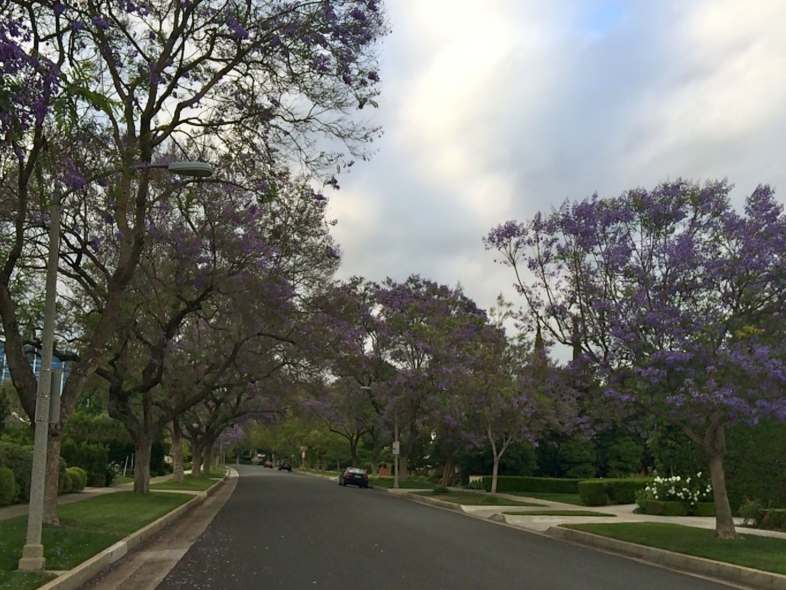 The Jacaranda trees are blooming all over the city and I wanted to share my own pictures of them that I took on the street directly behind our house here in Beverly Hills. To augment my photos, I have included a video clip from Huell Howser’s Jacaranda episode. For those of you who don’t know him, Huell Howser was a star chronicler of California life, urban and rural. He was from Tennessee, but loved California with a passion and traveled all over the state finding special subjects everywhere.