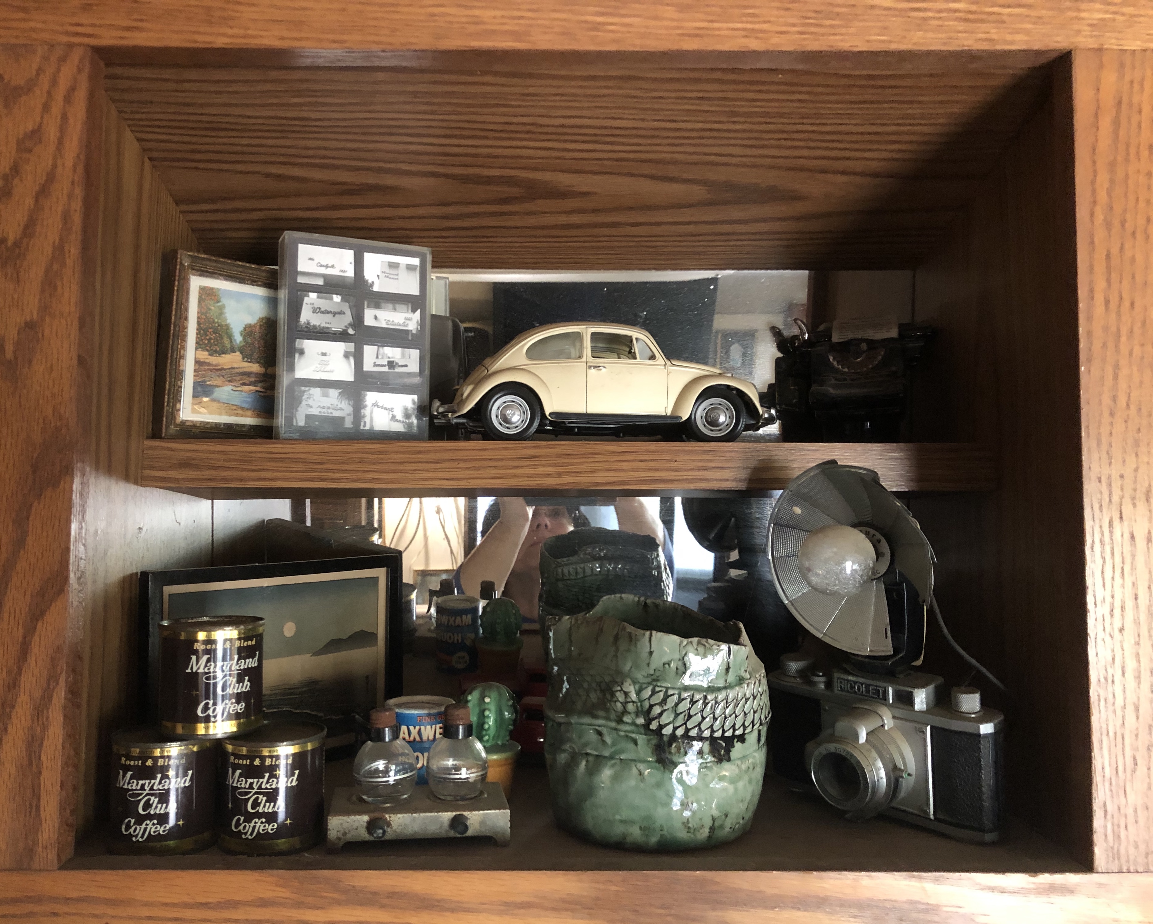 What you’d have to know is that Ray put these shelves together quite intentionally. The beige VW is an exact replica of my first car; the dingbats are a particular kind of architecture Ray loves; the coastline postcard is of Ensenada, Mexico, where our son-in-law is from and a place we both love; the typewriter represents my writing; the hand-built vase is one I made in a ceramics class Ray, Liz and I attended about five years ago; the miniature coffee pots and cans of coffee represent Ray’s ever-growing love of coffee; the cactus it like the ones we have here in our cactus garden; the flash camera shows Ray’s love for photography and is also like ones we used for the 650 Chili’s restaurants we personally provided decor for from 1982 – 1997; and the vintage postcard reminds the viewer of what an orange grove like ours looked like 40 or 50 years ago. In other words, these two shelves represent large sections of our lives and loves over the past 40 years together. Is that not the sweetness thing ever?
