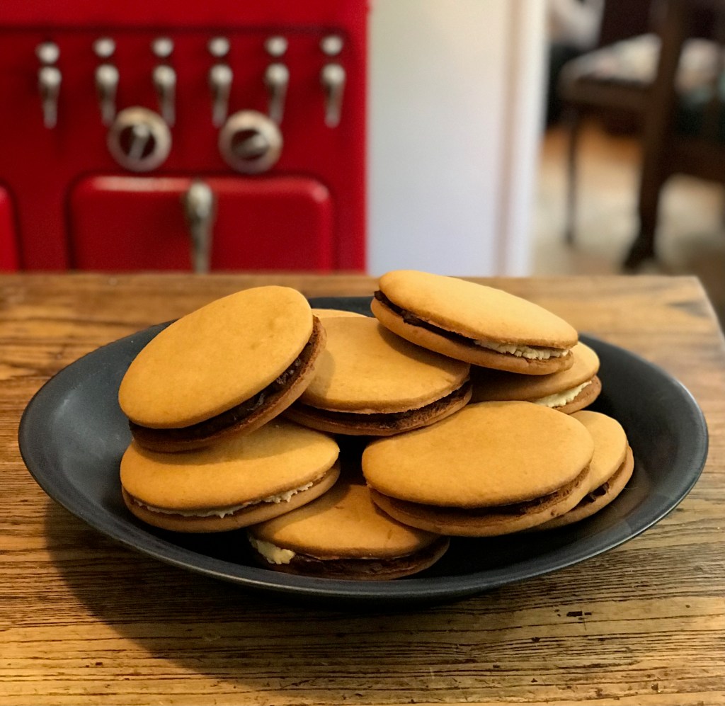 This is the long way around to say that today, Rachael, with the aid of a coveted Mani’s cookbook and Ray’s direction, re-created those wonderful chocolate truffle cookies. She also made some with vanilla cream inside, which are a combination of cocoa butter wafers and honey.