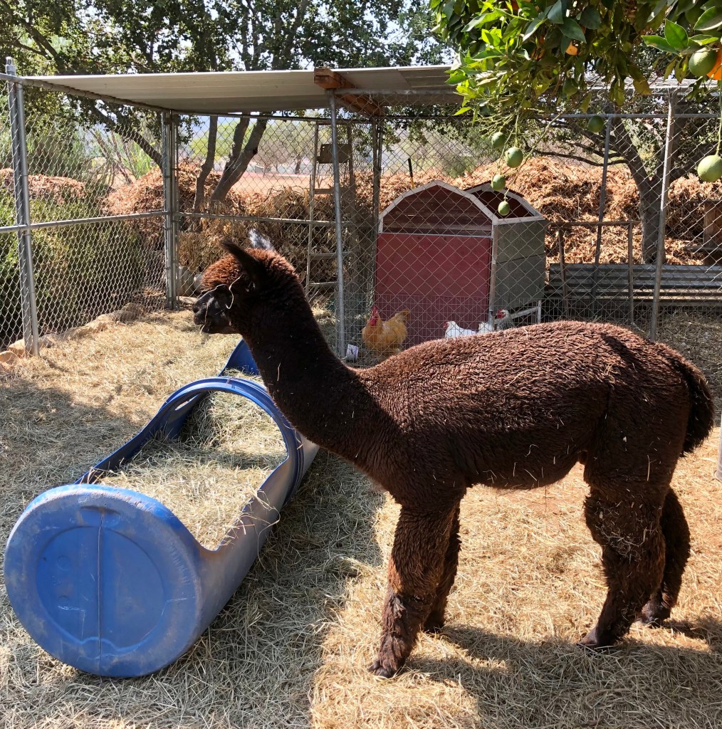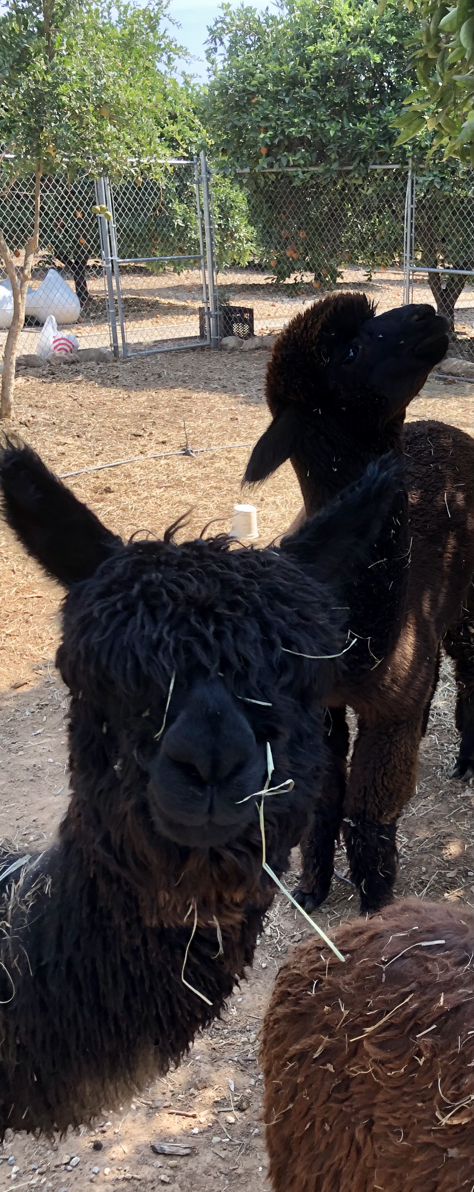 Liz and Ron have added a lot of features to our orange grove since they moved here but these four additions are the biggest improvement of all. Introducing: Finn, Jimmy Jet, Leroy and Buttercup. They are all young male alpacas who have come to live at our orange grove and be neighbors with the chickens and rooster.