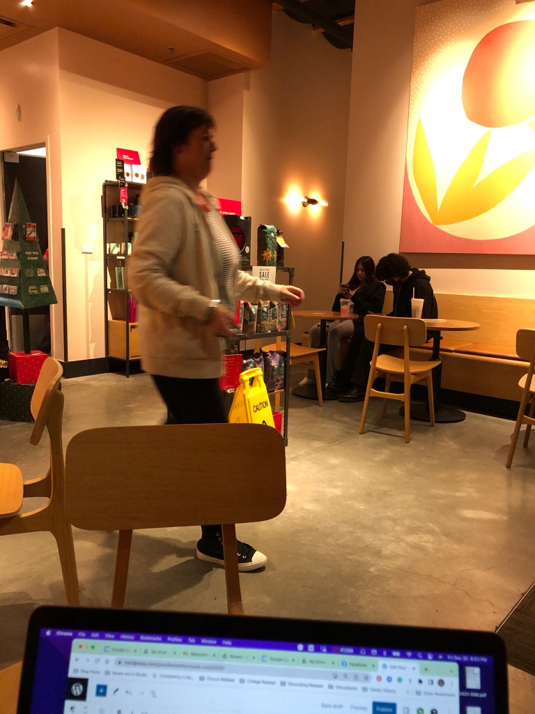 Often there are only a few people with computers sitting alone at tables. They, like me, look as if they need a strong internet connection. They too have a single cup of tea or coffee in front of them, the price required to linger for a while. This late afternoon, however, there are no other people with computers, but rather several tables occupied by two-three people who have clearly gathered to spend time with one another and chat. I hear both English and Spanish, lots of spirited conversation, and occasional bursts of laughter. The workers, in contrast, are quietly restocking and cleaning since almost everyone in here has already purchased their drinks.