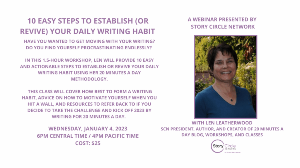 On Wednesday, I will be presenting a 1 1/2-hour webinar for Story Circle Network on establishing a daily writing habit. This webinar is for women only and is for writers of all levels from beginners to published authors. (Sometimes even published authors get out of the writing habit, after all.)