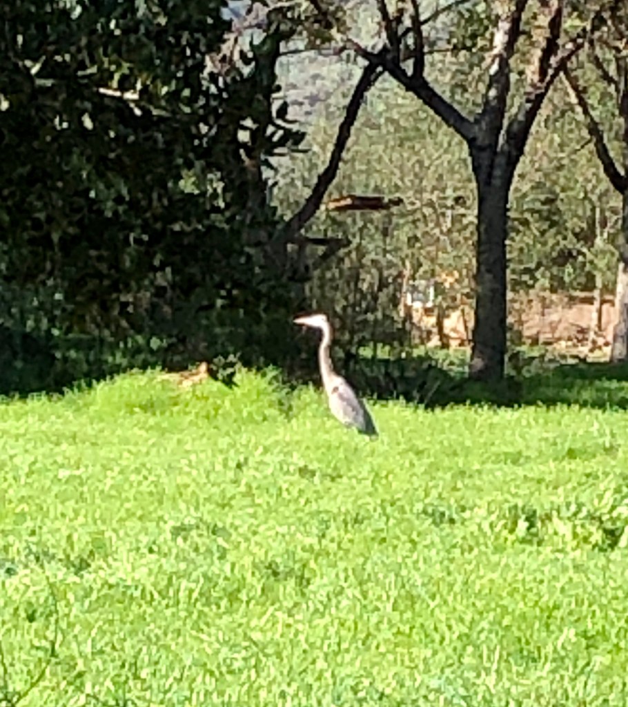 The best news (besides seeing Ethan) is that there was no rain today and the sun was out. The grass is green everywhere because of all the rain, which is also very nice. I snapped a photo of a blue heron in the field next door today. You can see it below.