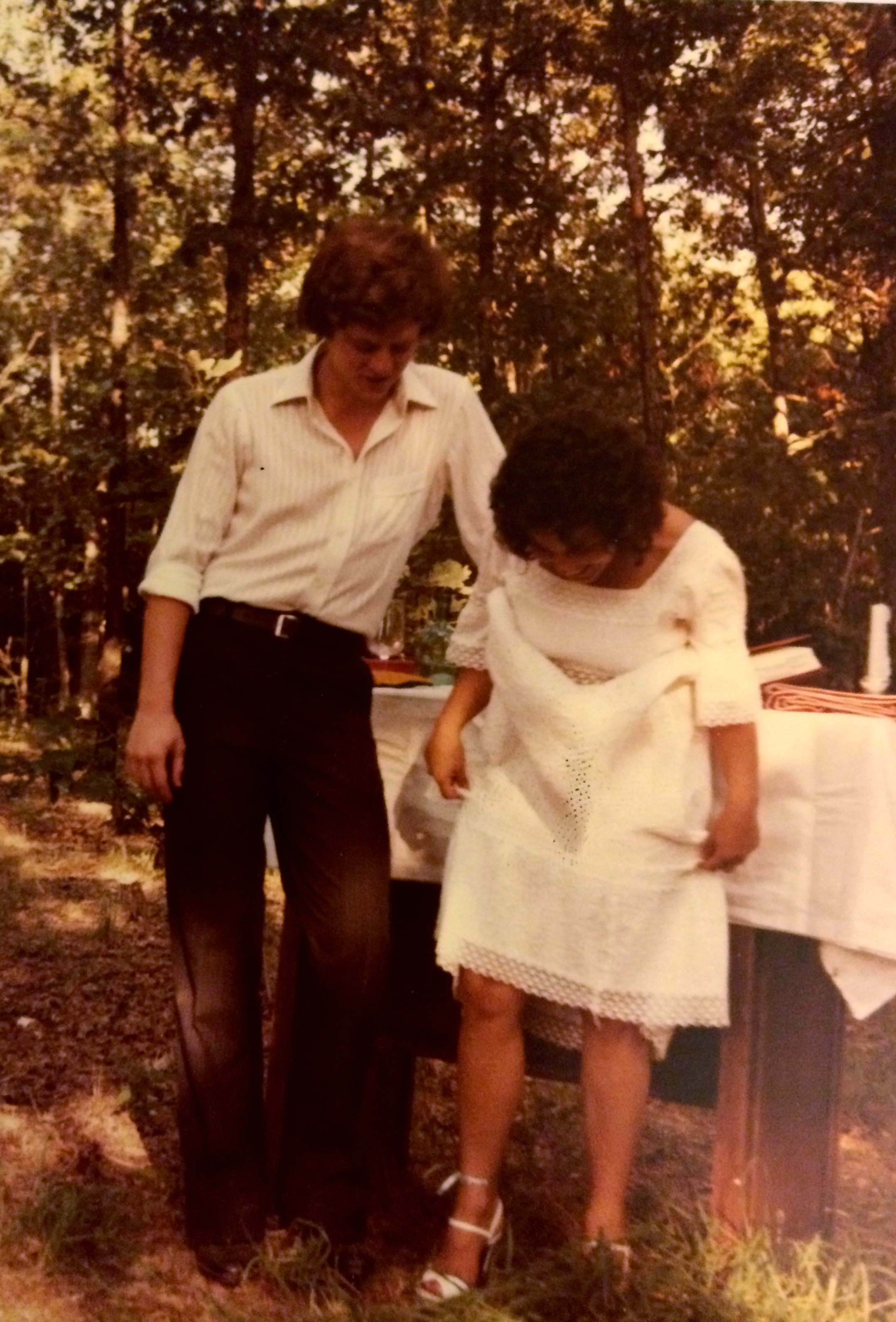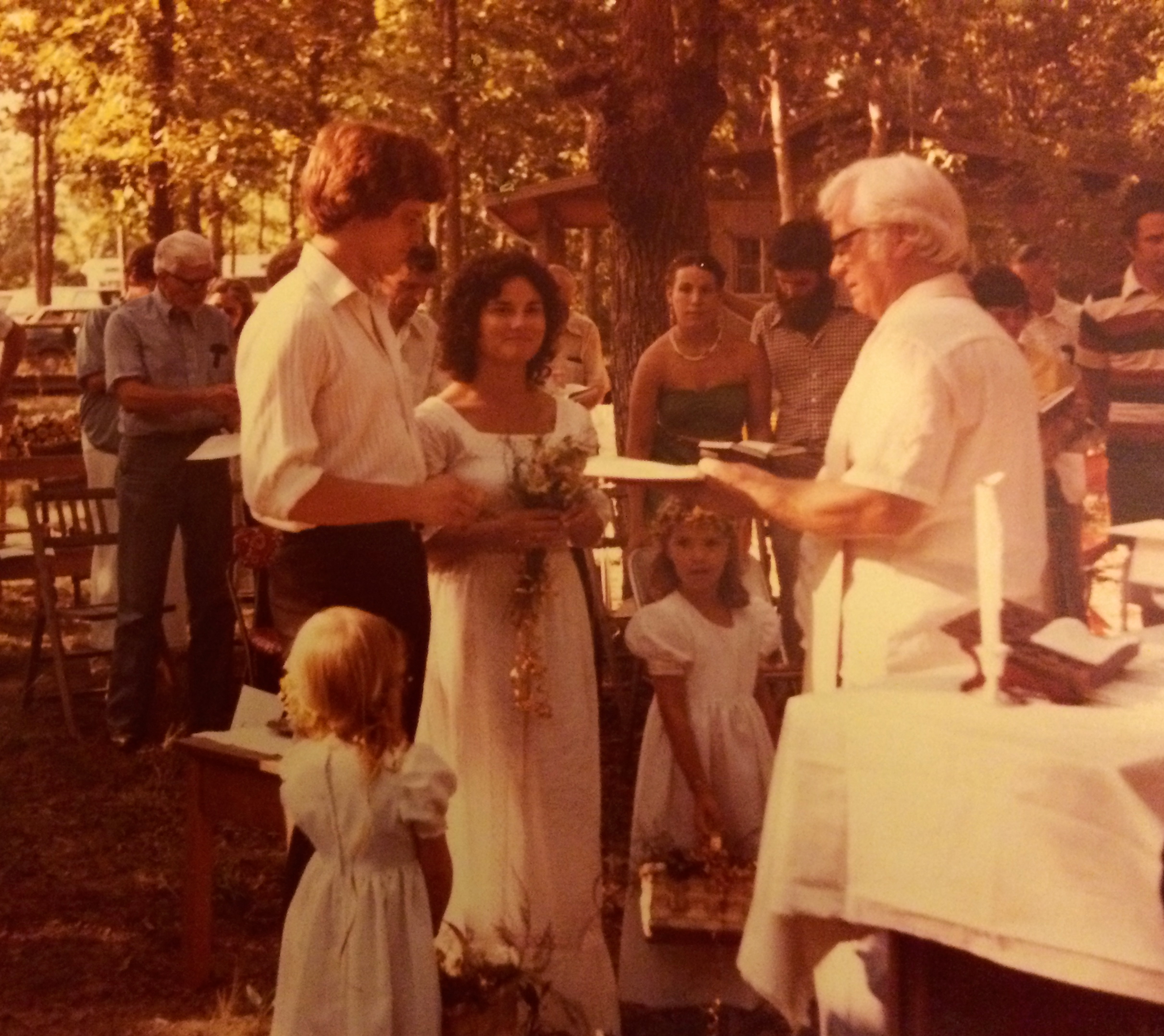 Knowing that I was not keen on any kind of party planning, my friend Shirley Patterson singlehandedly coordinated every detail of our wedding blessing with the Stone County Congregation at George’s home. She even found the dress I wore, brought it to my work over my lunch hour, and pinned it so that a seamstress could alter the hemline. This ceremony featured the Patterson girls in gorgeous matching bridesmaid dresses, a wedding cake decorated with real flowers, and a potluck lunch filled with homemade goodies. The only thing Ray and I did was buy champagne for everyone and show up on time. This event felt very much like our official wedding, full of joy.