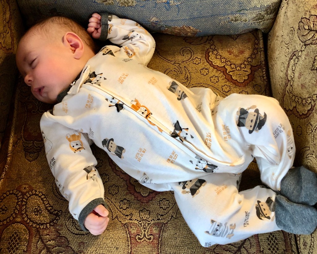He has dark blue eyes and a little curl on the top of his head. He might also have Liz’s olive skin. We will wait and see on his eye and skin color.