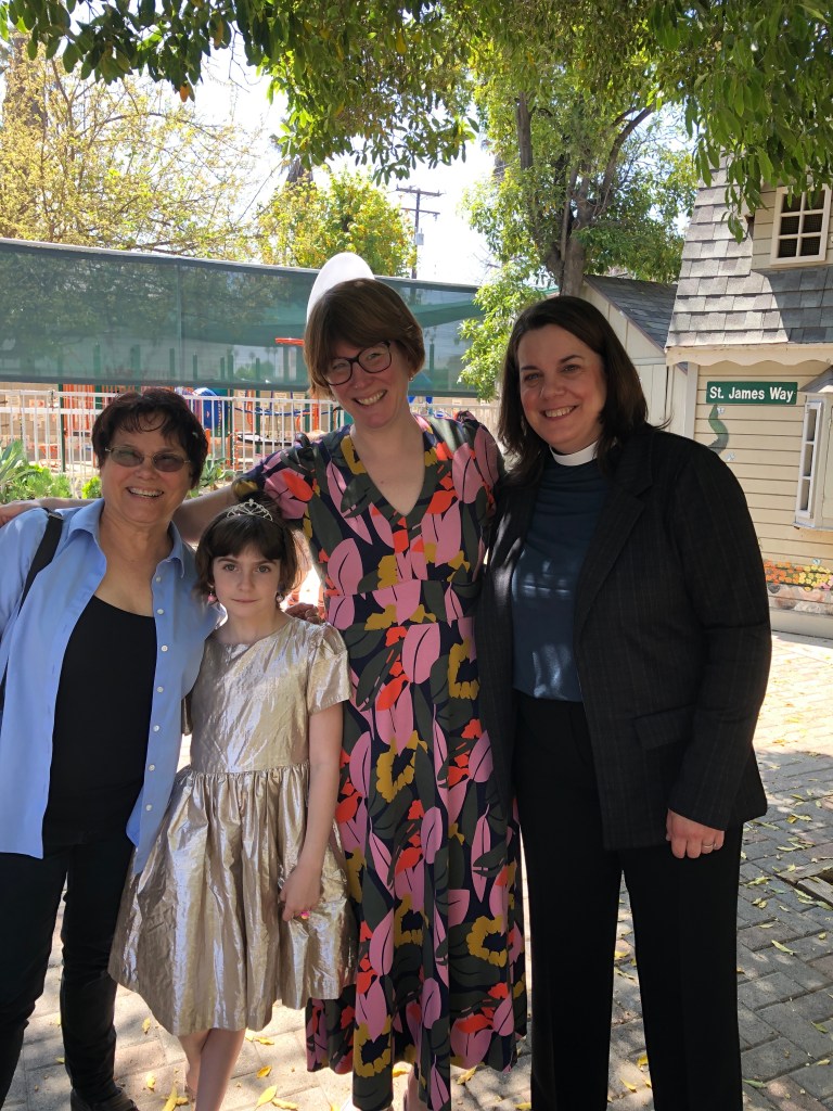 This morning, Ray and I headed to St. Thomas the Apostle, Hollywood at 8:15 and then served as the official Easter Bunnies for the egg hunt. We hid 150 – 200 eggs in the garden of the rectory and then awaited the arrival of the 20 or so children with their parents. Sarah brought Nico and Lyla from South Pasadena; Liz, Ron, Ethan, and Ron’s mom, Cindy, came from Hollywood. After the egg hunt and much visiting with old friends, we headed to South Pasadena to St. James Episcopal Church where Luna sang with the children’s choir for Easter. We met the two priests there plus several parents with their small kids. Ray and I also saw a former parishioner from St. Thomas, who has chosen St. James because of its strong children’s program for her daughter. The kids participated in a second Easter Egg hunt there.