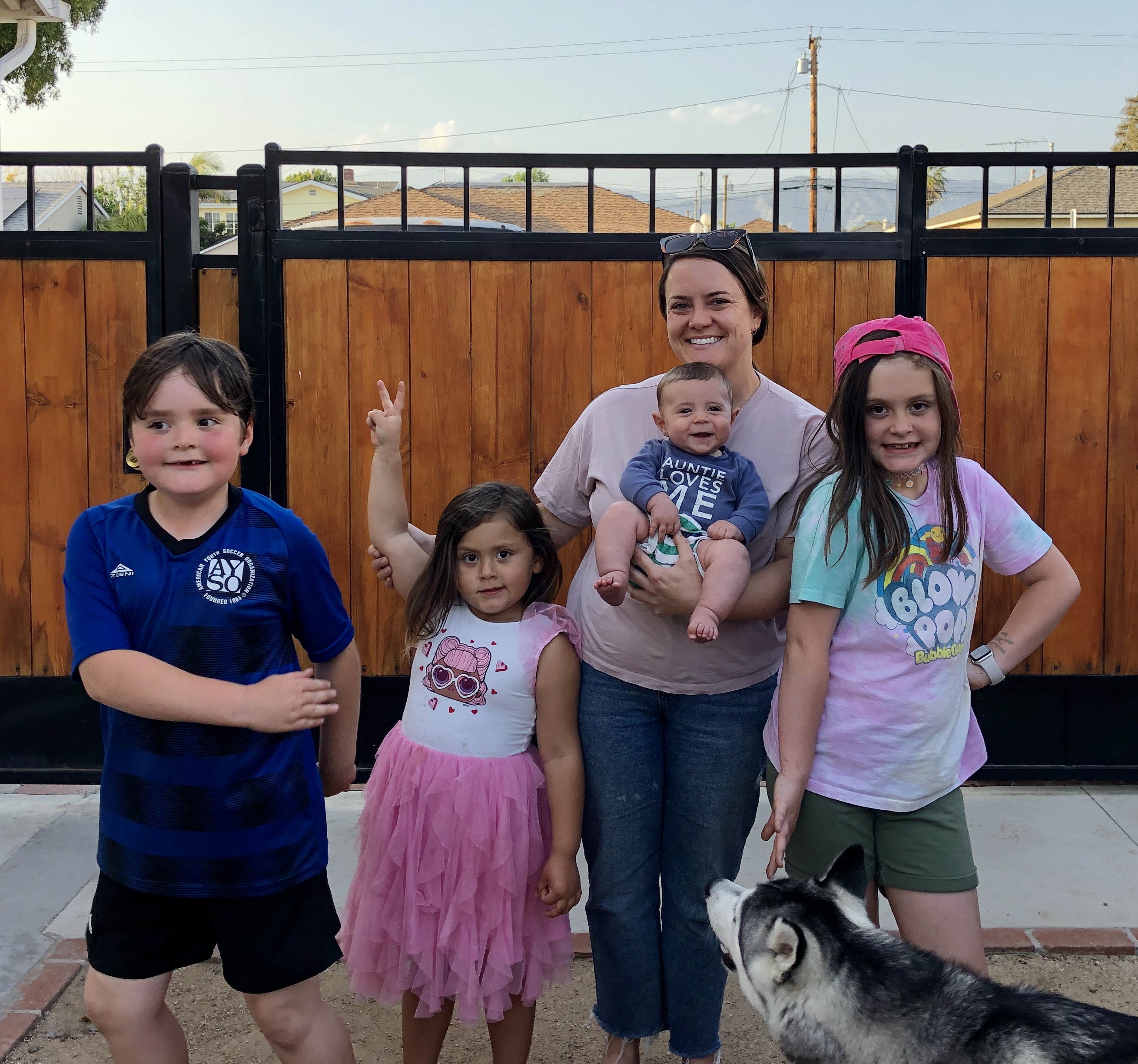 Rachael with her two nieces and two nephews plus Luna, the husky.
