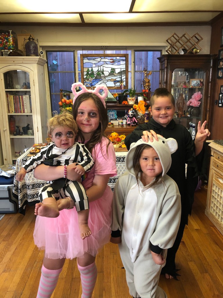 Beetlejuice (Ethan) Carebear (Luna) Koala Bear (Lyla) and “Scream” without his mask (Nico)