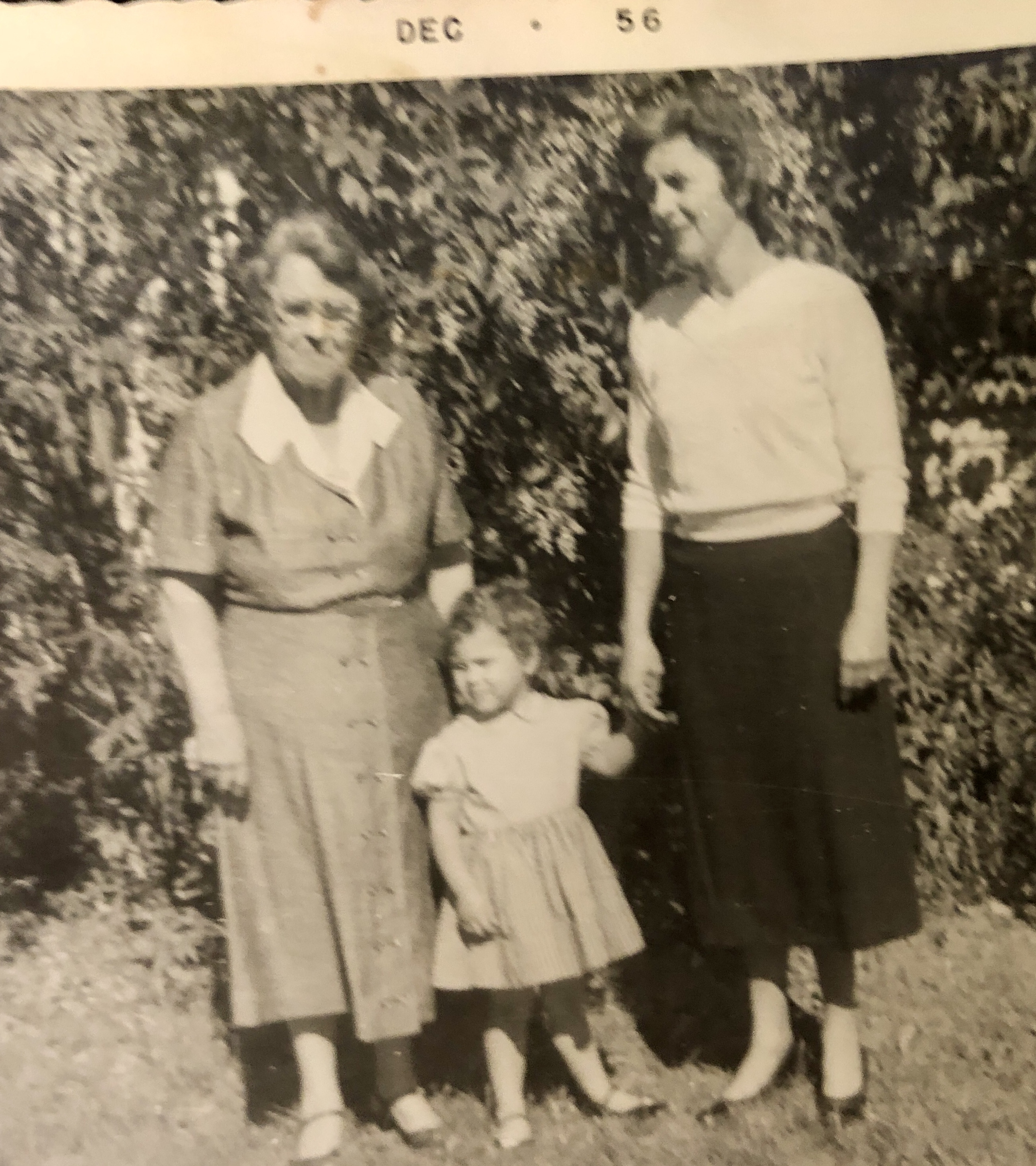 I was going through a box of old photos that had been stowed away for years, and I came across some wonderful shots of my family that I’d never seen. I’ll be writing about a few of these over the next week or so, but couldn’t resist sharing one photo that is dated December 1956. This one features my mother, maternal grandmother, and me. Since my birthday is in January, I was one month shy of four when this photo was taken. My grandmother, who was born in 1878, was 78 at this time. Mom, born in 1918, was 38.