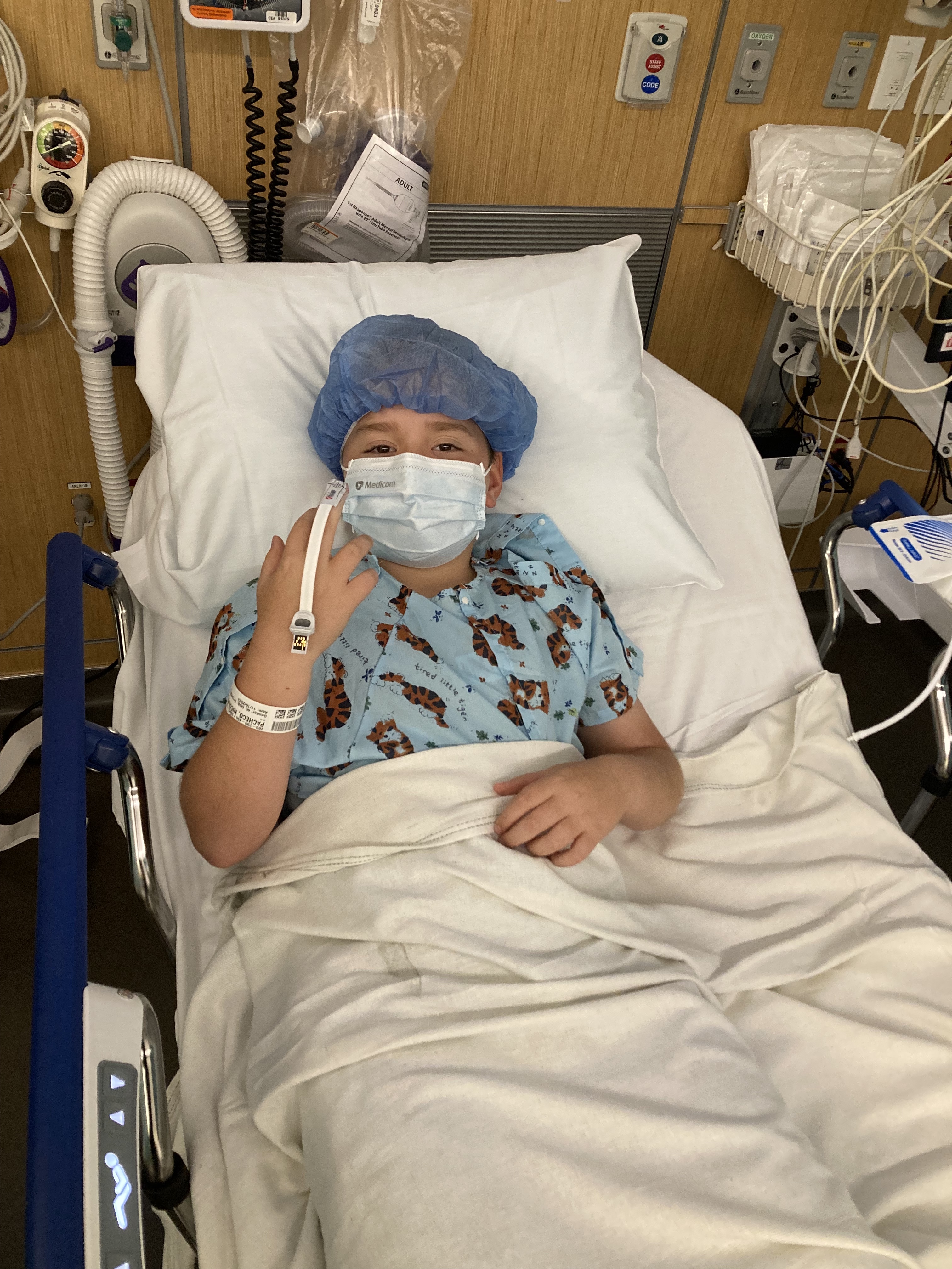 Today, our 7-year-old grandson Nico had a 4 1/2 hour surgery at Cedar Sinai Hospital for an ear condition called cholesteatoma, which according to the NHS is “an abnormal collection of skin cells deep inside the ear, which can damage the delicate structures inside the ear that are essential for hearing and balance.” The surgeon removed a large collection of skin cells and scar tissue from Nico’s ear and also two of the small hearing bones due to damage. Also, she replaced the covering over his eardrum with a prosthetic covering. In a year, she will perform a second surgery to see if there has been any regrowth of the cholesteatoma and to assess the need to insert prosthetics to replace the two small ear bones. The surgery today was considered a complete success and Nico returned home late this afternoon after spending several hours in recovery due to anesthesia.