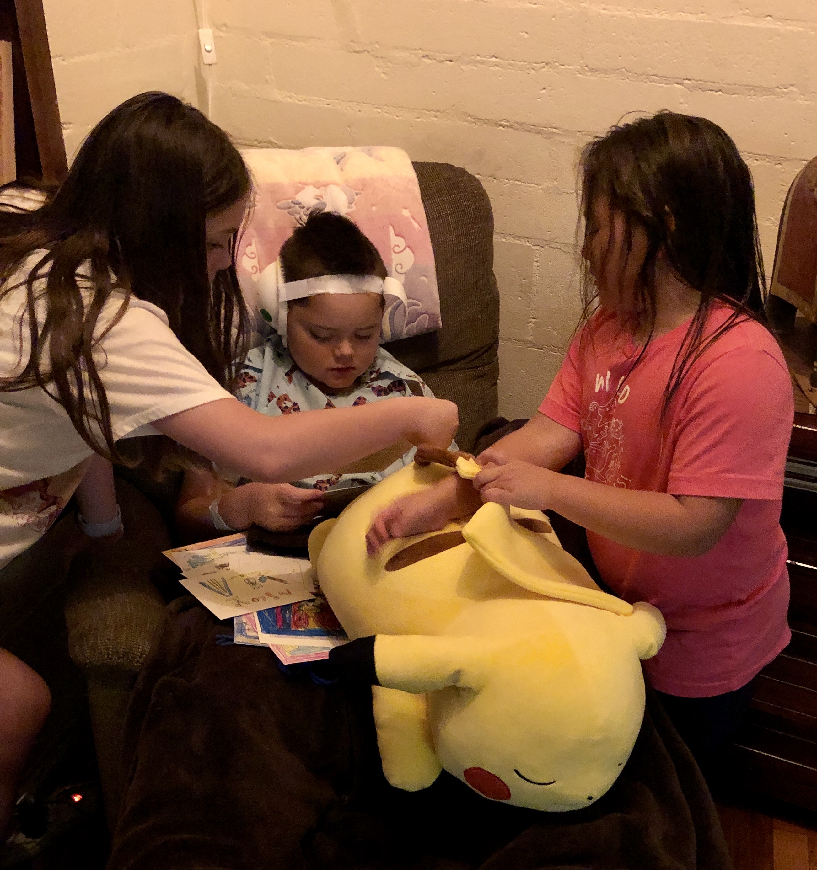 Gregorio carried Nico into the house upon their arrival and Nico sat downstairs in a recliner for a short time to have some jello and ice cream. It wasn’t longer, however, before he requested to go upstairs to bed. He was bright-eyed but clearly tired. His sisters were happy to have him home. Luna read him the cards that his classmates had made for him while Lyla stood nearby. We were all happy and relieved to see that he was doing well even after all that anesthesia and extensive surgery.