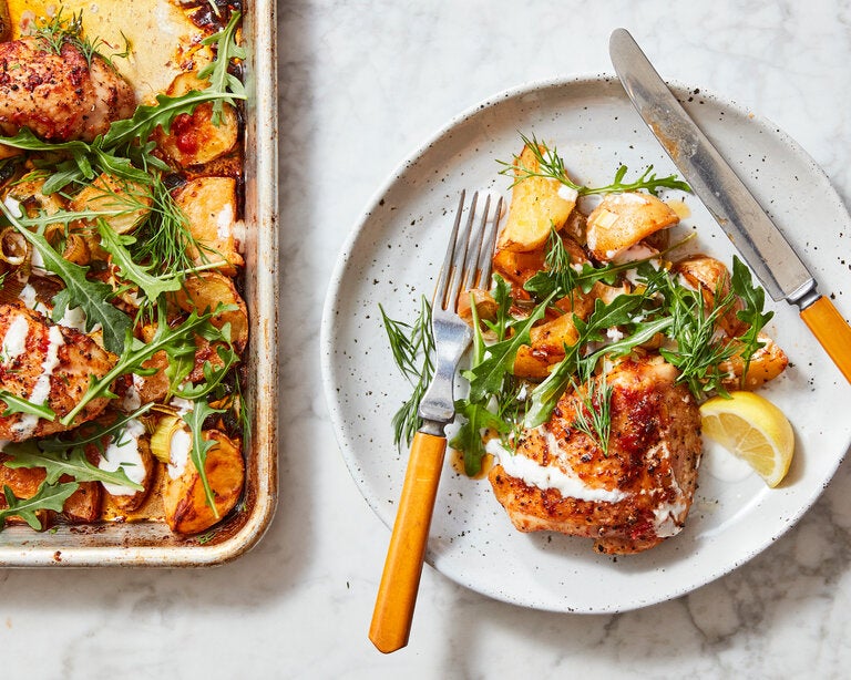 Sheet-Pan Chicken With Potatoes, Arugula, and Garlic Yogurt
