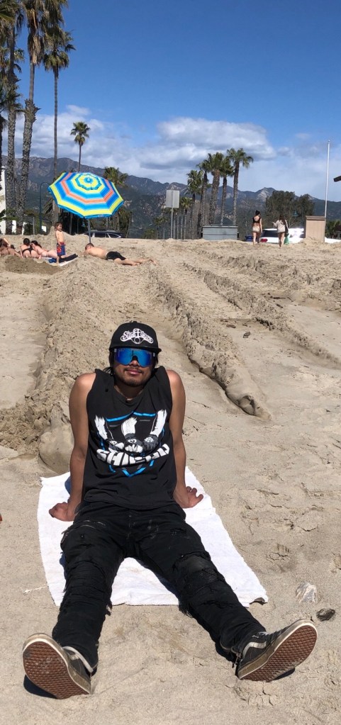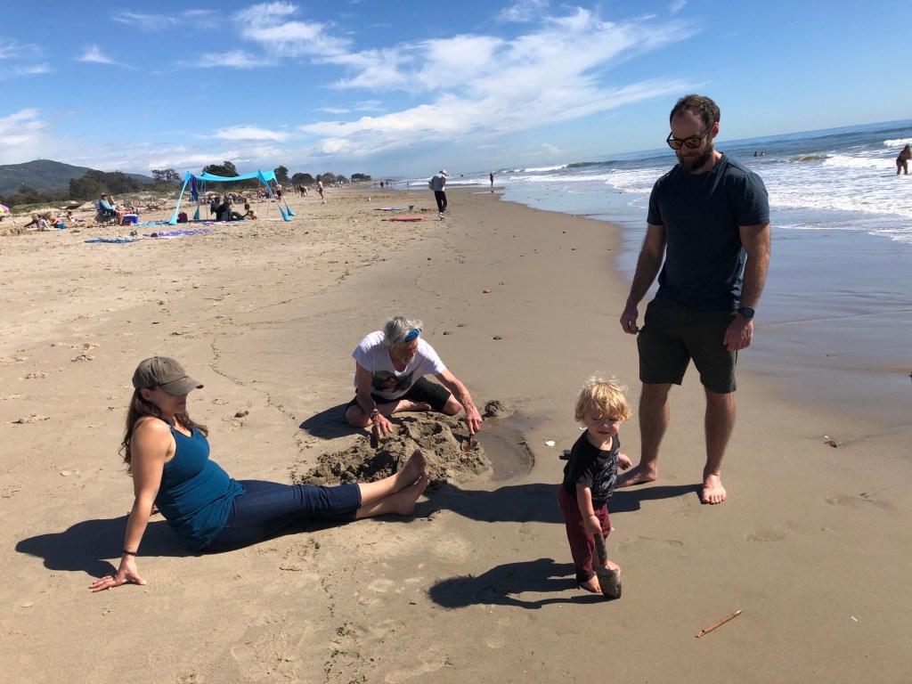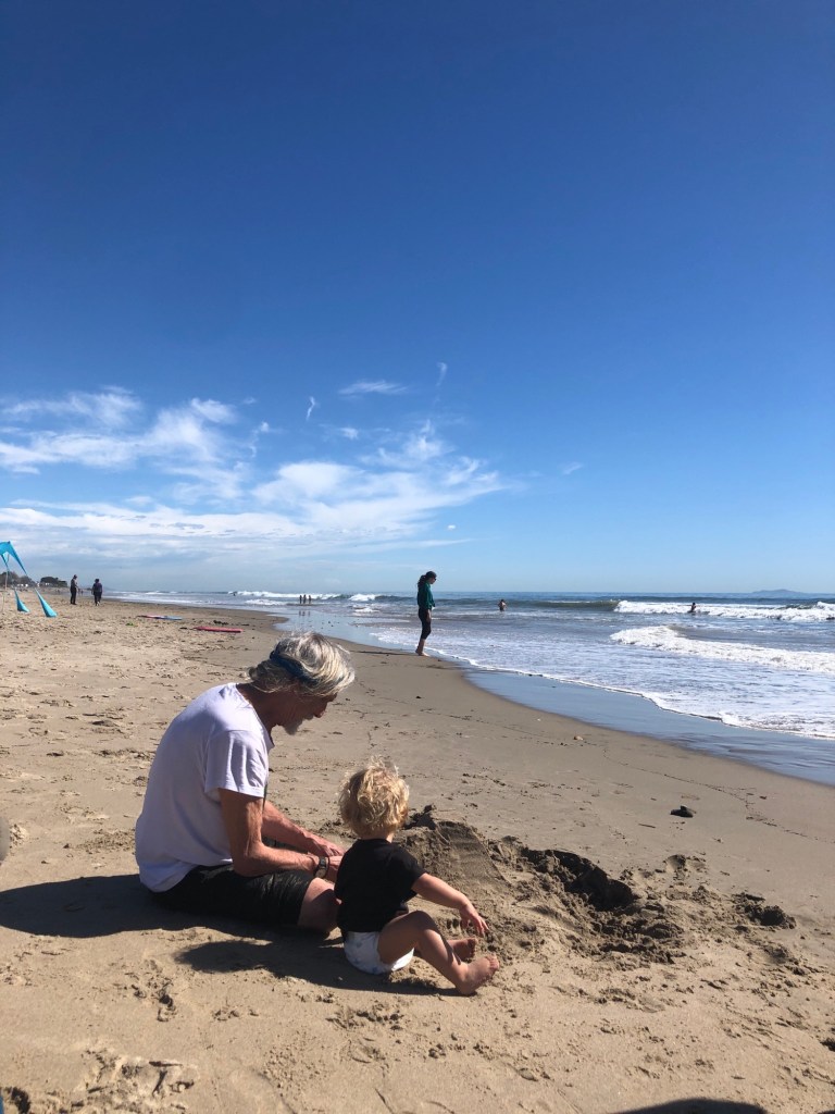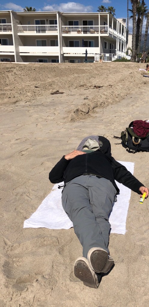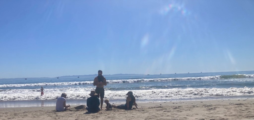 Today, we headed to Carpinteria, a little beach town just north of Ventura. Our old friend Sonny Crawford and his son Sovahn are visiting from Shelburne Falls, Massachusetts and we figured they’d enjoy a nice sunny day right on the edge of the Pacific. Liz, Ron, and Ethan joined us as well and we spent several hours luxuriating at the beach listening to the rhythmic sound of the waves and watching others beach goers playing in the water. An absolutely lovely way to spend an afternoon.