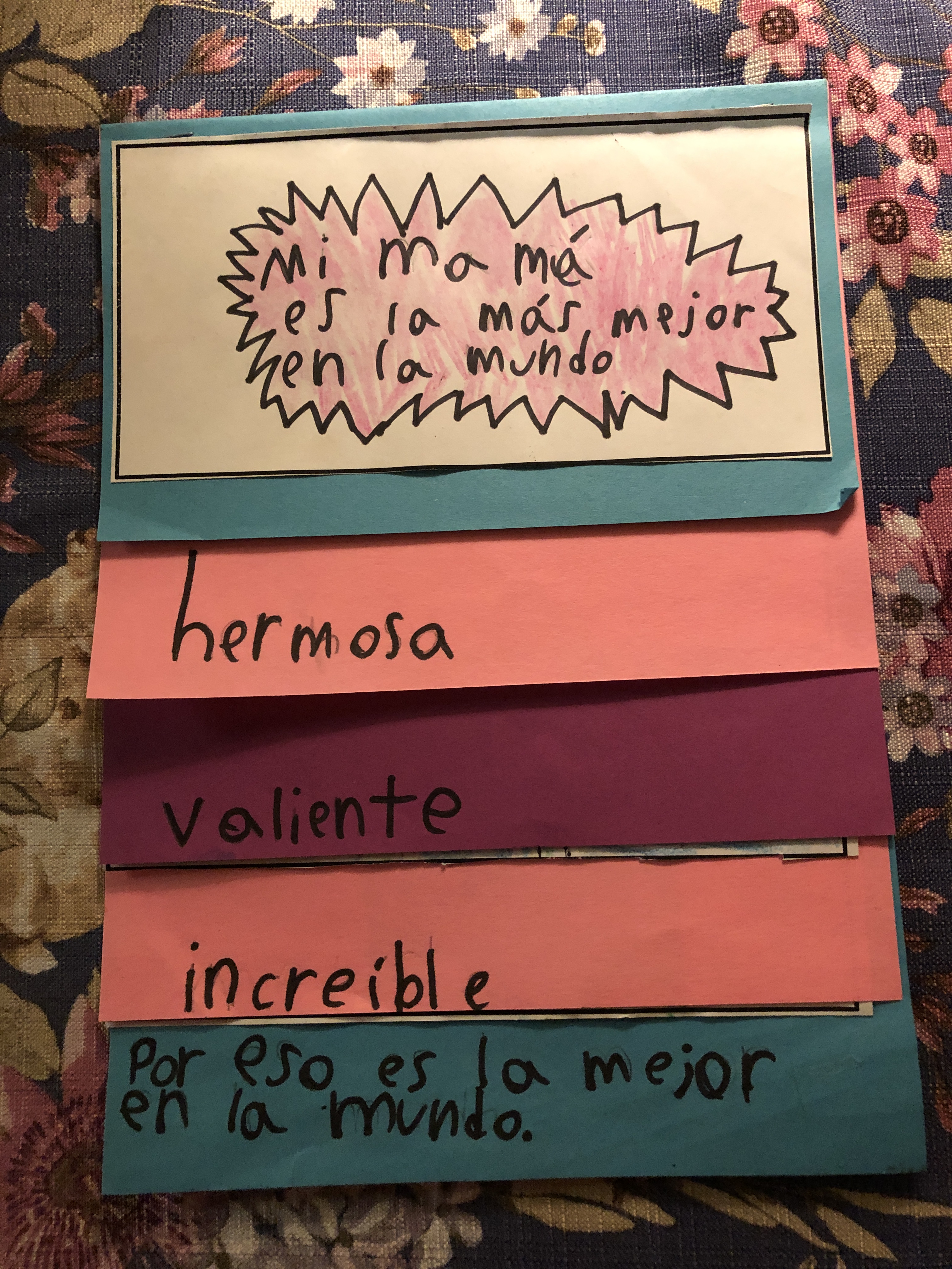Nico’s Card for his Mama Sarah. (He is in 2nd grade in Dual Immersion English/Spanish)