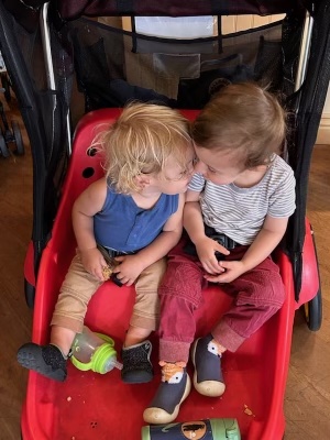 Here is a photo of our 17-month-old grandson Ethan at Disneyland yesterday with his new friend, Jack. Liz said that since Jack is a year older, it took a little while for the two boys to warm up. Clearly, by the time this photo was taken, they were buddies. Just looking at this picture makes me happy.