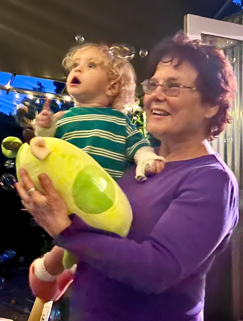 Ethan and Grandma watching bubbles floating through the air from a bubble machine.