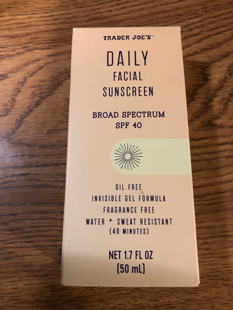 My daughter Sarah gave me a tube of Trader Joe’s sunscreen for Christmas. She said it has the same formula as a much more expensive sunscreen but at Trader Joe’s prices. I was skeptical about why this particular product would be “so much better” until I opened the tube and applied some on my face. Instead of the heavy, pore-clogging lotion of typical sunscreens, this was light and blended in almost immediately. Also, once on, it created a matte finish, which is not anything I’ve experienced before with sunscreen. I don’t wear makeup, but if I did, I’m sure I could easily apply it on top of this sunscreen with great results. On the label, it says it’s fragrance and oil-free, has an invisible gel formula, and is water and sweat-resistant for 40 minutes. It is also a “broad spectrum” for daily use and SPF 40.