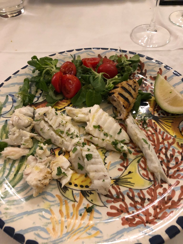 We are all staying at the Art and Jazz Hotel, and theirs were the first familiar faces we’ve seen so far. We went to a restaurant that the woman at our hotel’s reception recommended, and the food far surpassed my expectations. The first photo is of homemade pasta with fresh clams, and the second is of grilled sea bass with one of Ray’s swordfish rolls. Everything was absolutely fresh and delicious. Rich and Jan had tiramisu for dessert, and I can say from my one bite that it was excellent. Jan and I agreed this meal alone was worth the trip to Sicily. The restaurant is Dal Panda Osteria: Pesce, Cotto & Crudo (Fish, Cooked, and Raw),