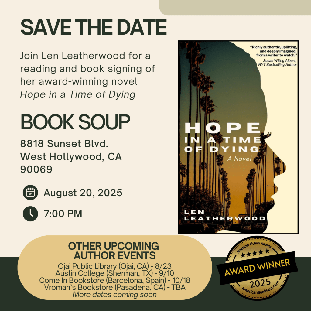I am pleased to announce that I will be doing a reading and book signing for my novel Hope in the Time of Dying at the iconic bookstore Book Soup on the Sunset Strip in West Hollywood on Wednesday, August 20th at 7 pm. Over the thirty years we lived in Beverly Hills, I dropped by this wonderful independent bookstore on many occasions and dreamed of a day I might give a reading there. On a whim, I wrote a request for the book signing, expecting either a standard rejection notice or perhaps no response at all. Imagine my surprise when, only a few days later, I received an email asking which dates I might be available. I am still pinching myself.