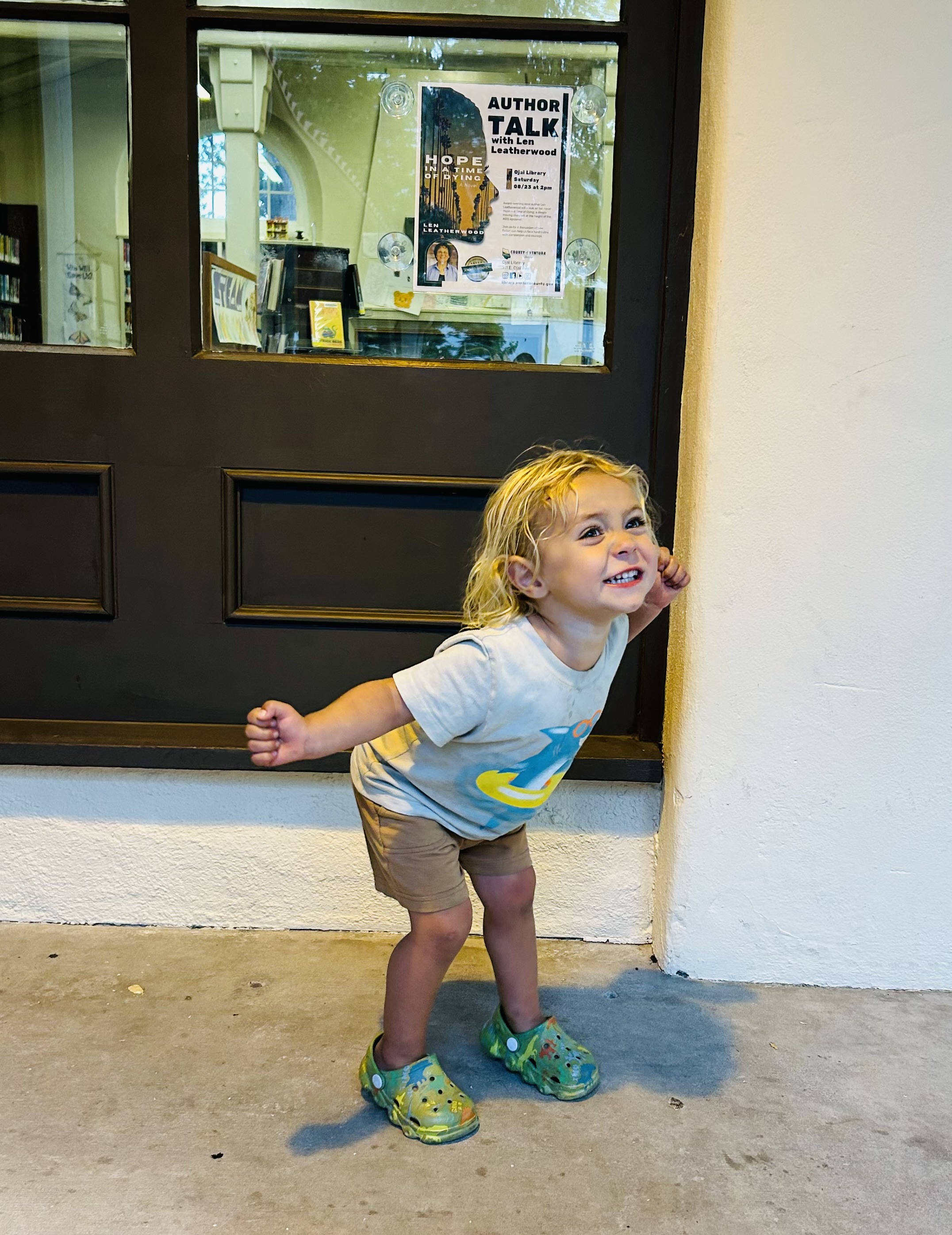 Here is my little grandson, Ethan, 2 1/2 years old, seeing a photo of Memaw in the window of the Ojai Public Library. This flyer is the announcement of my reading for my book, Hope in a Time of Dying, on August 23rd.