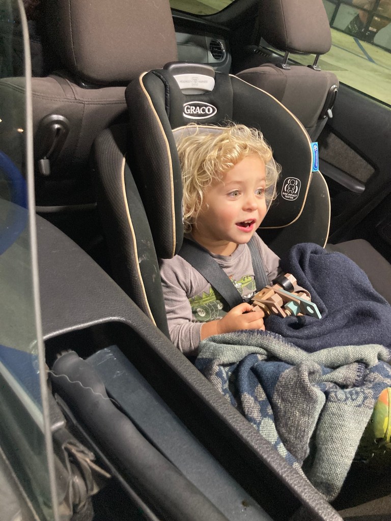 Ethan in his seat with a blanket as we drove our convertible with the top down to the gas station.