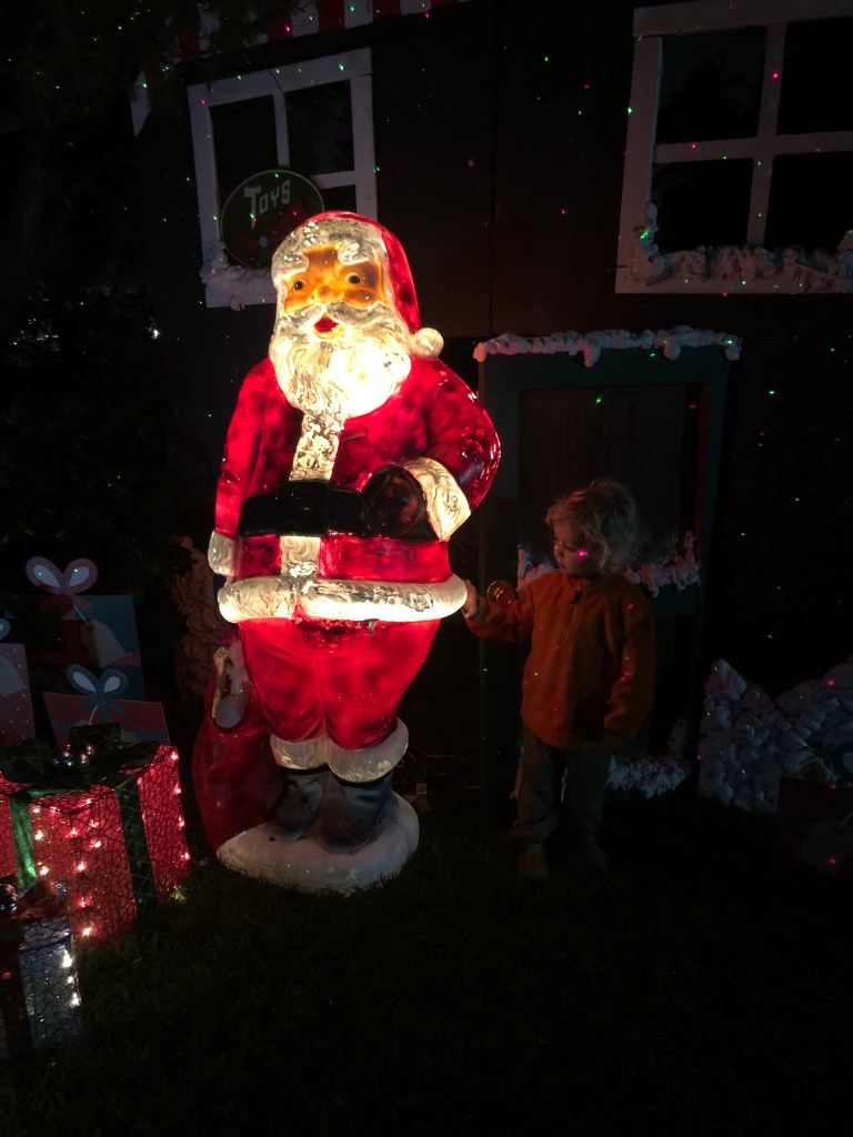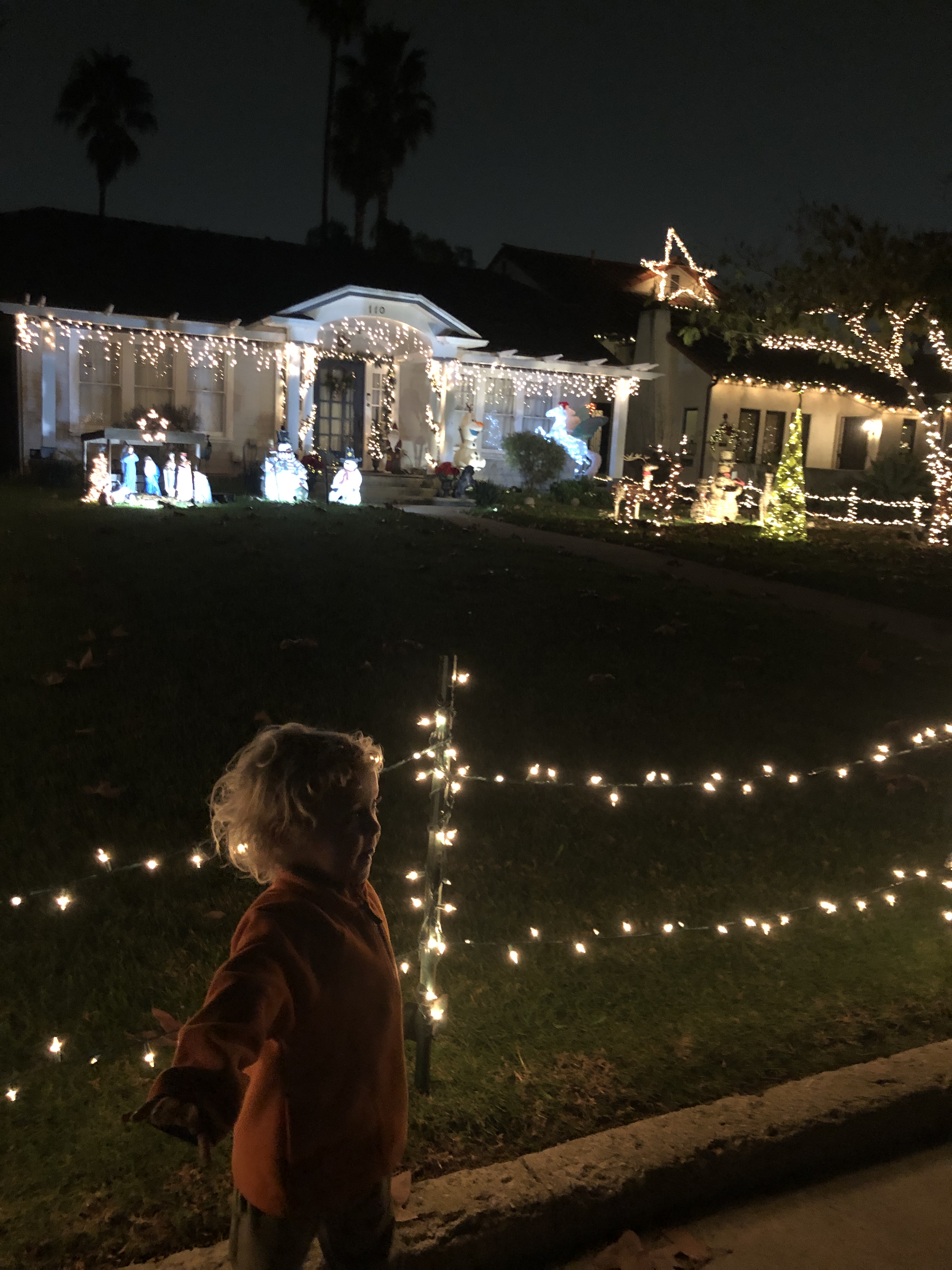 We had lots of fun walking up and down several neighborhood streets, seeing twinkling Christmas lights and displays of Santas, reindeer, snowmen, and one stable scene with baby Jesus, Mary, and Joseph surrounded by the three wise men and three full-sized stuffed camels.